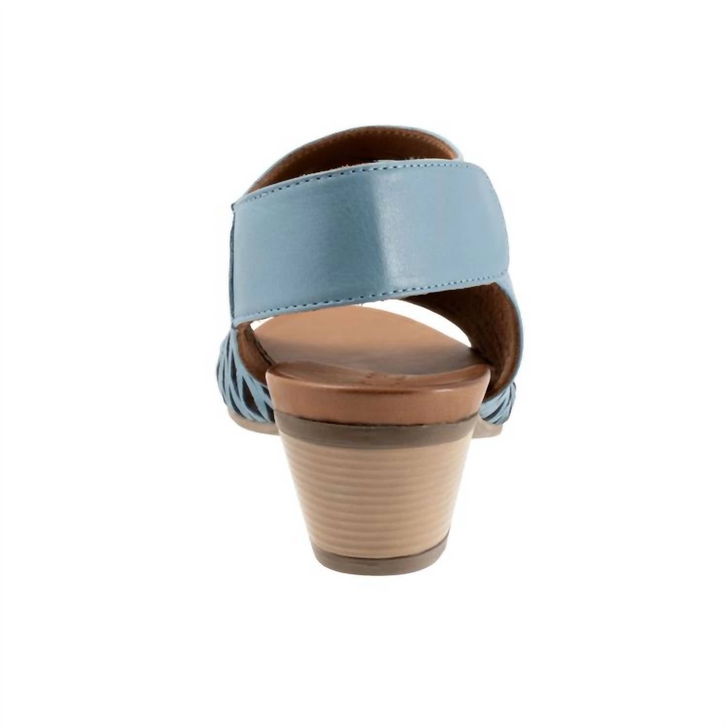 Experience unparalleled comfort in classic denim. Crafted from leather upper and lined for a luxurious feel. Feature a practical adjustable hook and loop fastening system alongside an innovative perforated design that conforms to your foot's unique shape. Completed with a synthetic rubberized sole and a stylish 2" block heel for day-long wearability. Enjoy the sophistication of these peep-toe sandals.