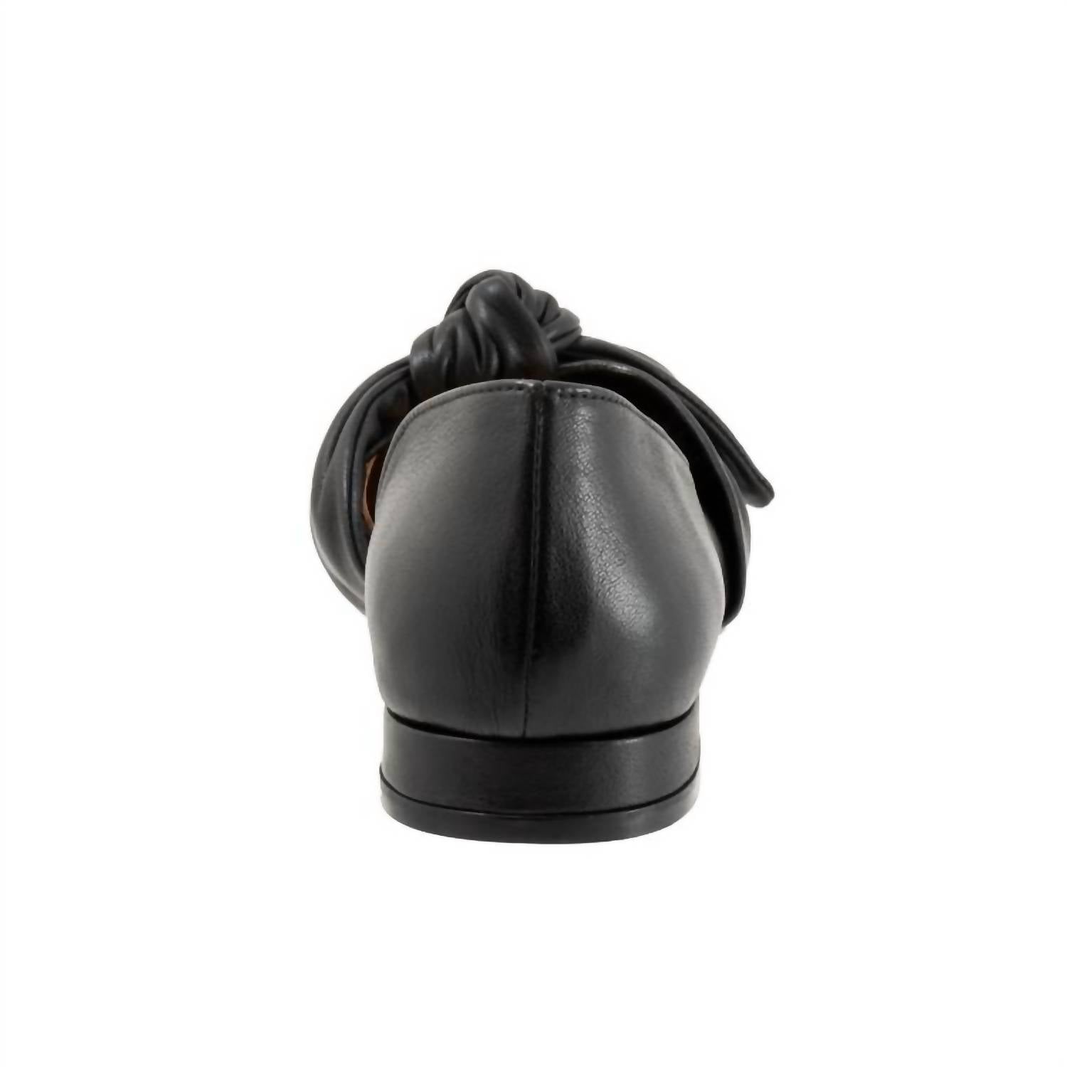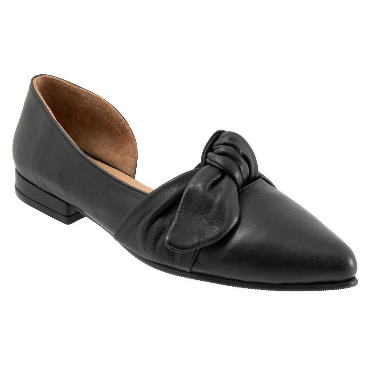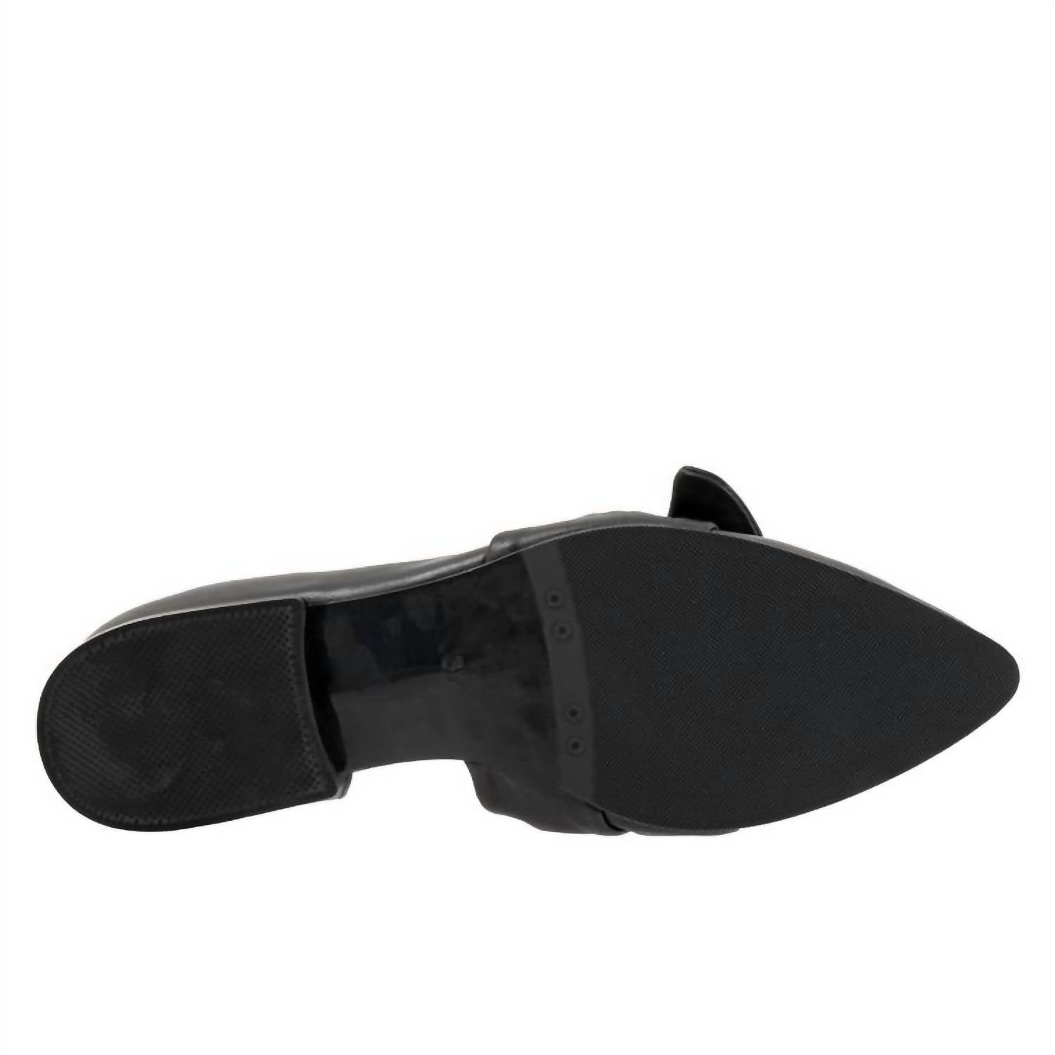 A classic loafer that is both comfortable and polished. Elevate your style with the Women's Smooth Leather Flat Shoes by Bueno, a perfect blend of elegance and comfort. These flats feature a smooth leather upper with a playful strap that ties into a charming, asymmetrical bow across the toes, complemented by a pointed toe silhouette. Designed with comfort in mind, they have a synthetic sole and leather lining, along with a low flat heel for a subtle lift. Available in classic black, these flats are ideal for a sophisticated finish to any outfit.
