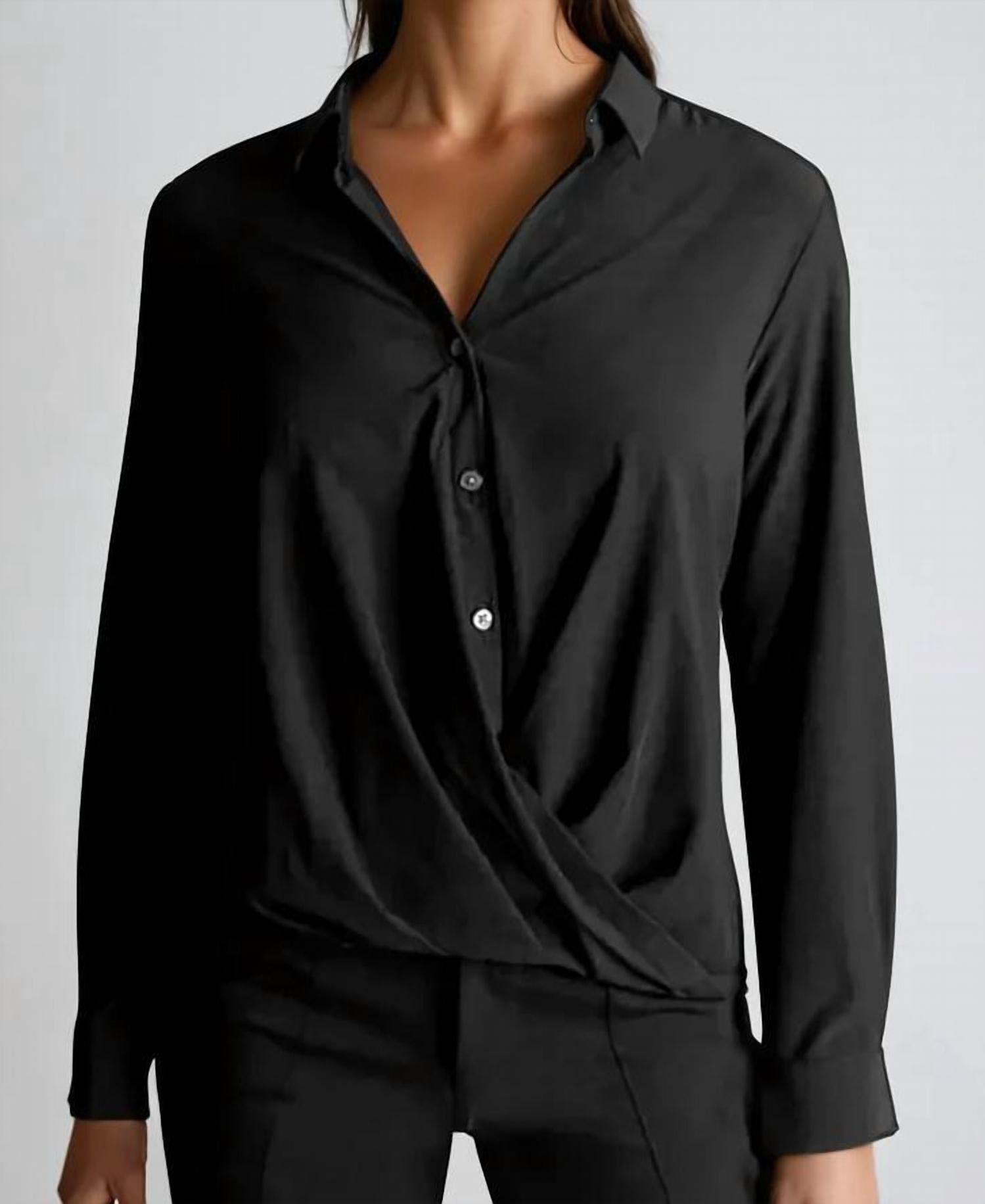 Elevate your wardrobe with the Barcelona Shirt by Buki, a sleek and breathable choice in solid black. This long sleeve shirt features a classic silhouette with a beautiful front drape and a pleated crossover hem. Crafted with Buki Tech Light fabric, it offers engineered moisture management and four-way stretch, ensuring comfort and a wrinkle-resistant finish. Closure: Button closure. Care: Machine wash. Ideal for travel and workwear, making it a perfect gift for occasions like Mother's Day.