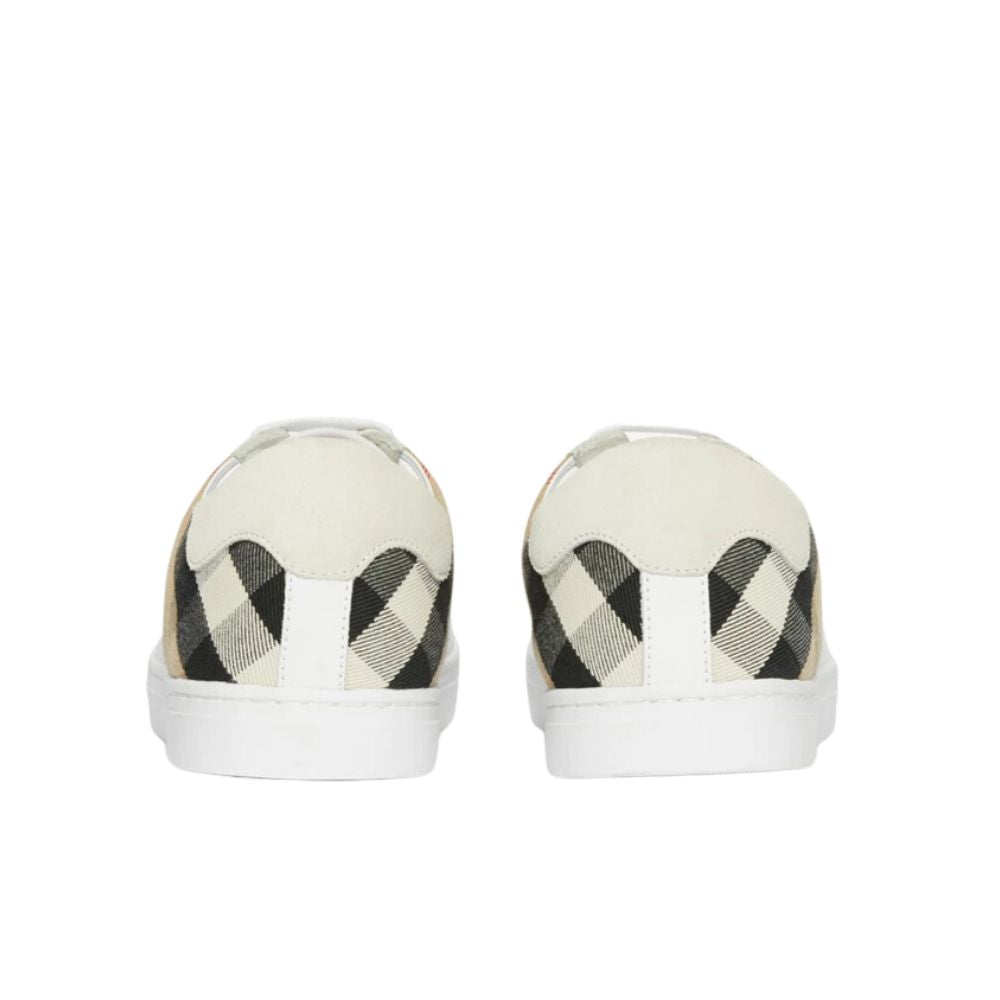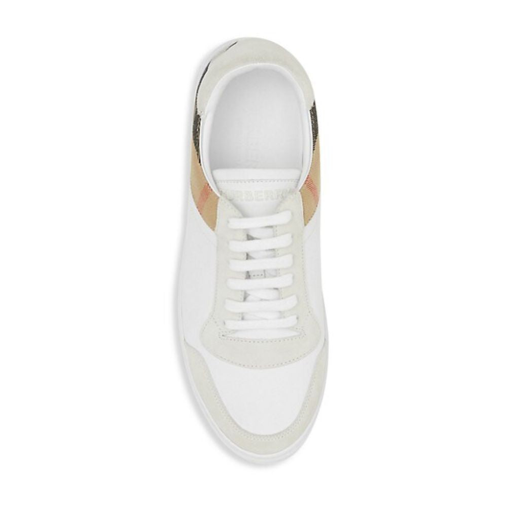 Burberry low-top sneaker in calf leather and suede. | English-woven signature House check heel counter. | Round toe. | Lace-up front. | Logo-embossed tongue.
