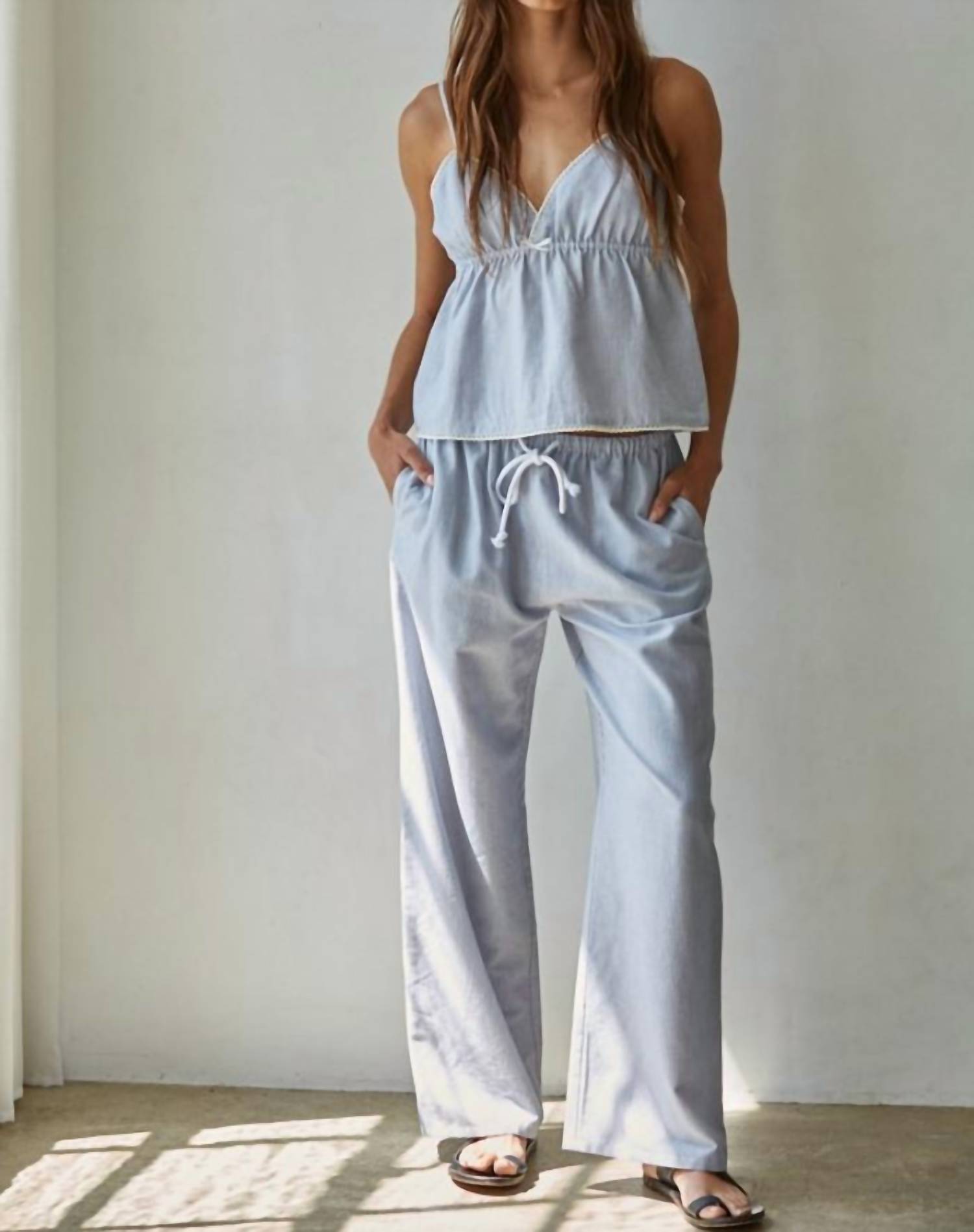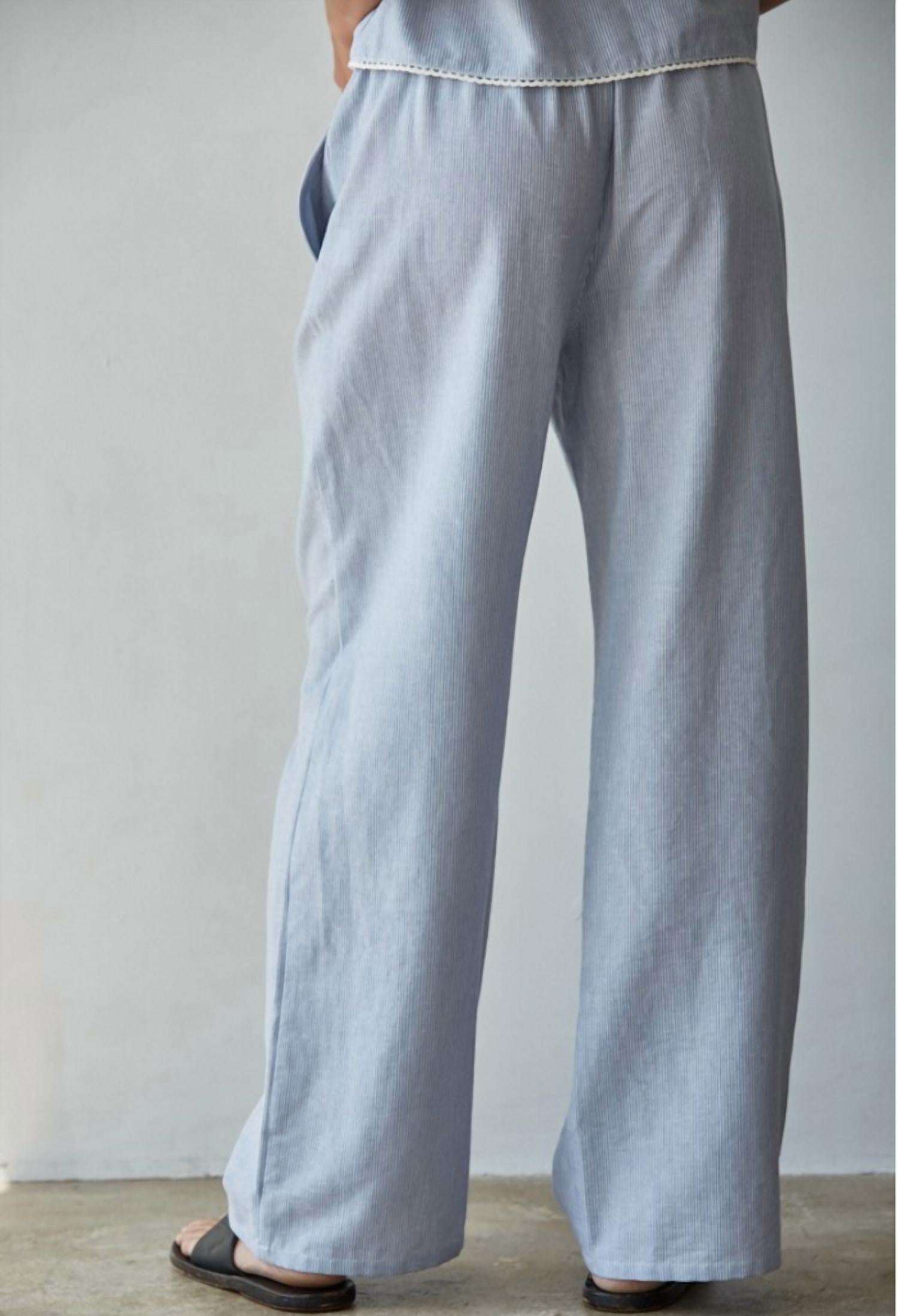 A perfectly tailored straight leg that you'll want in every color! Experience the laid-back charm of the Lake Life Drawstring Pant by By Together, perfect for summer relaxation. Crafted from a woven cotton-linen blend, these pants feature a light blue hue with a comfy elastic waist and a sturdy rope tie, ensuring a secure fit. The wide leg silhouette adds to the airy feel, while side pockets provide room for essentials. Designed with a boho chic vibe, these pants are pull on and perfect for vacation-ready days. Care: Machine wash and tumble dry for ease.