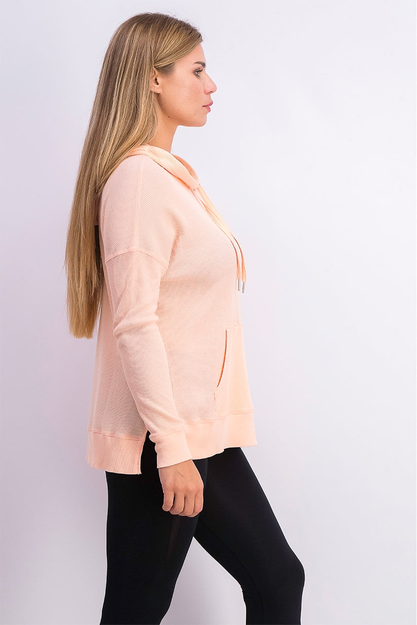 High-low hem for added coverage|INSPIRED FOR: Athleisure|Waffle knit|Drawstring hood; long sleeves with drop shoulders; kangaroo pocket|Cotton/polyester|Machine washable