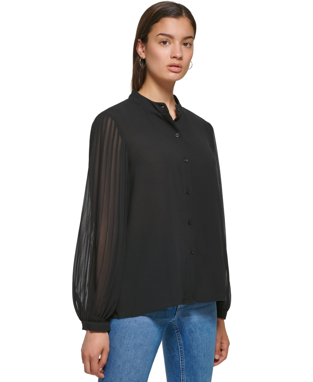 Calvin Klein Women's Pleat Sleeve Chiffon Button Front Blouse Black Size Large