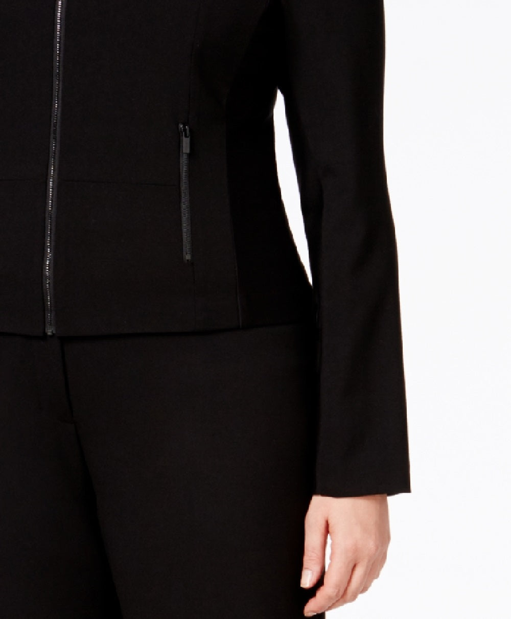 Stretch elastic panels at the sides lend an undeniable fit to this plus size| fit solutions| zip-front jacket by Calvin Klein.| Zipper front closure| Long sleeves| Side stretch elastic panels| Zipper pockets