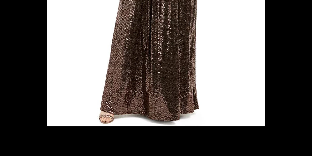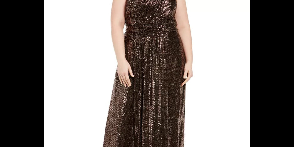 Approx. 62-1/2 long from center back neck to hem. Length is based on size 18W and varies 1/4 between sizes|One-shoulder neckline; Gown silhouette|Hidden side zipper closure|Copper-tone sequin/sparkle allover detail; drape at center front|IMPORTANT NOTE; This item arrives with a return tag attached and instructions for removal. Once the tag is removed from the dress; this item cannot be returned.
