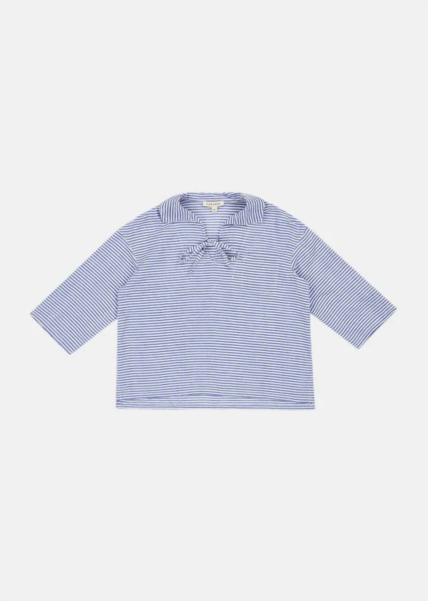 Introducing the Girl's Artichoke Top by Caramel, a 70s-inspired blouse in timeless nautical blue stripes. This piece features long sleeves and a charming tie at the center front keyhole neckline. Crafted from 100% cotton voile, it is ideal for seaside adventures.