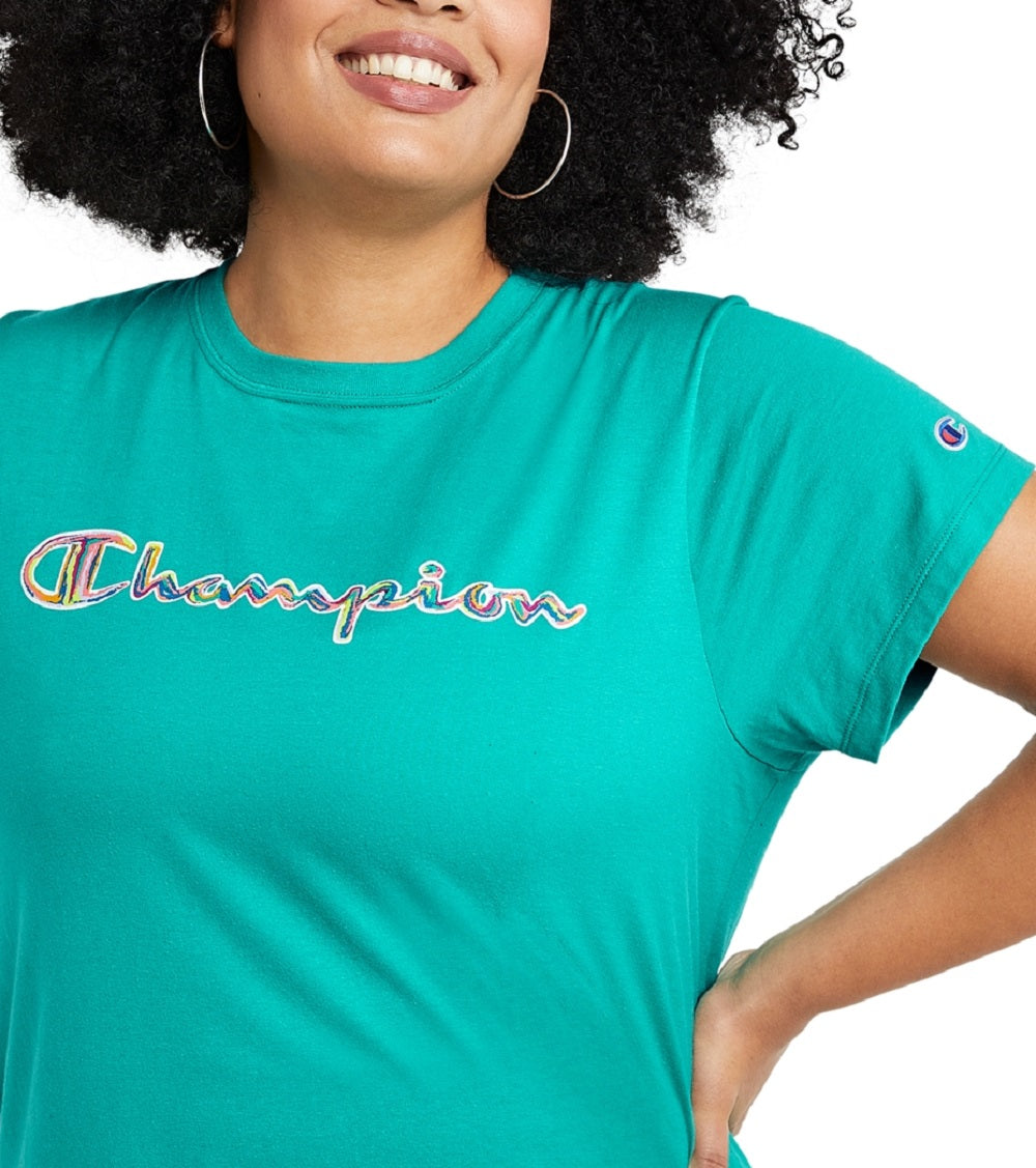 A spectrum of sporty style shines from the Champion script logo on this smart plus size T-shirt.| Approx. 28 long at front| Crewneck| Champion script logo at front and on back neck tape| C logo at left sleeve| Cotton/polyester| Machine washable