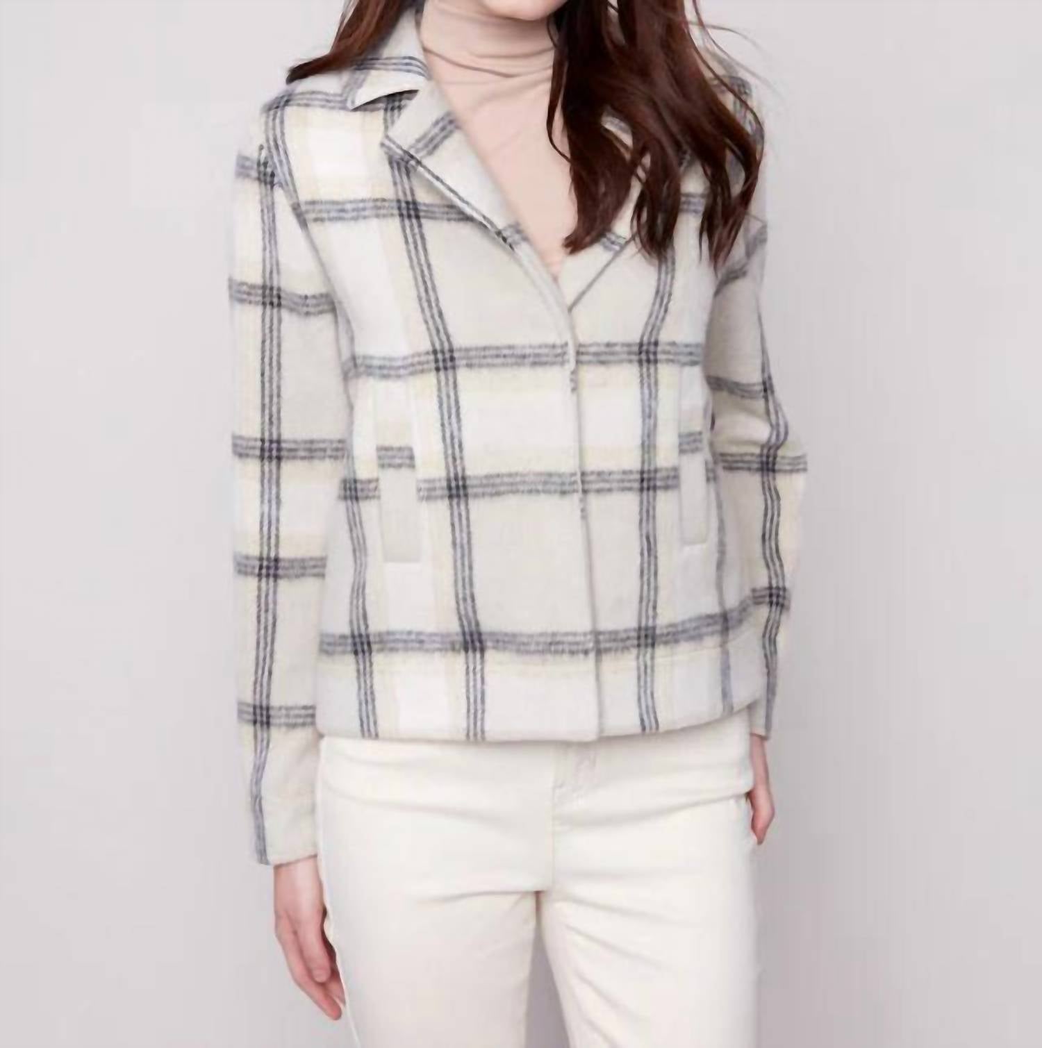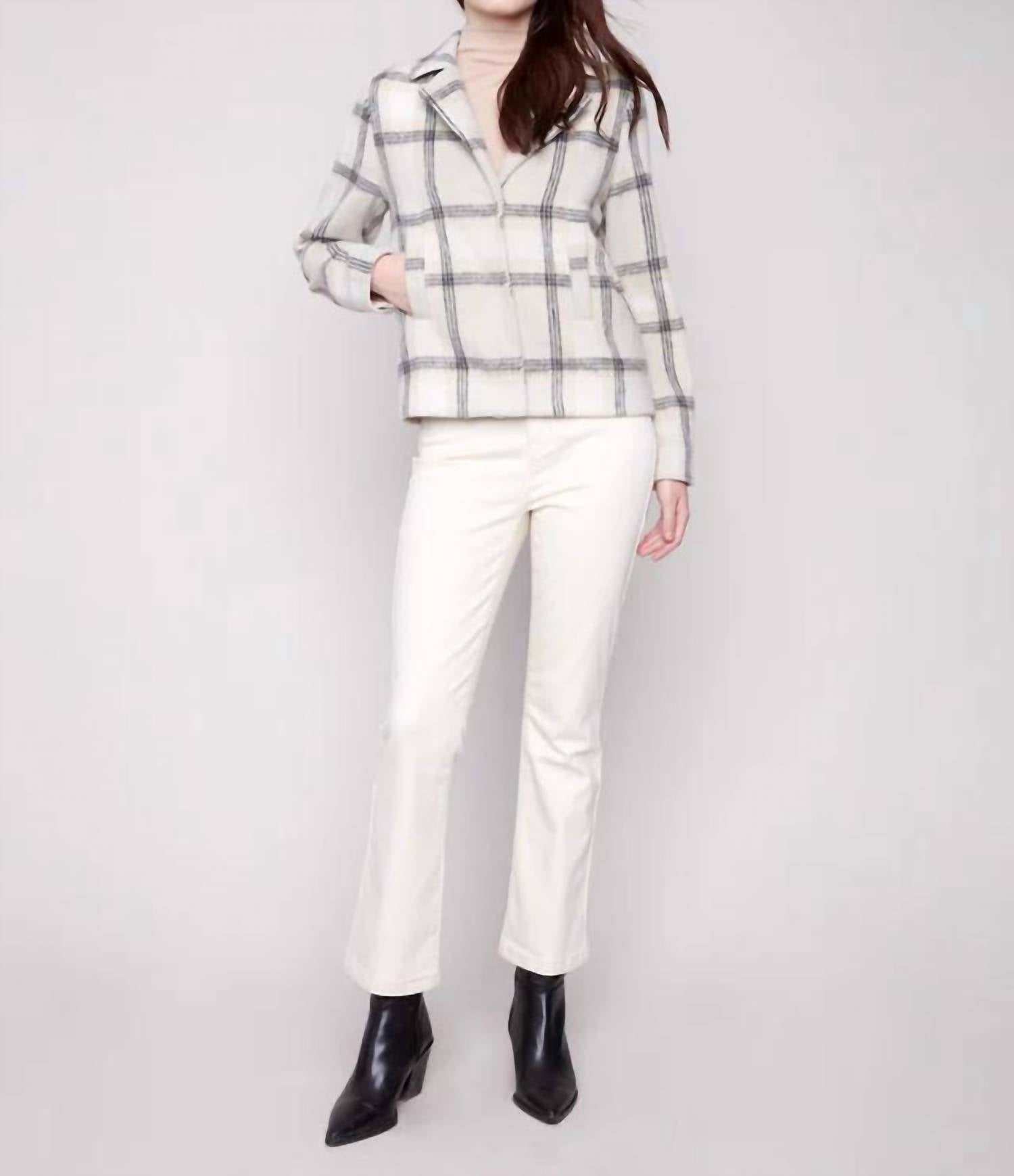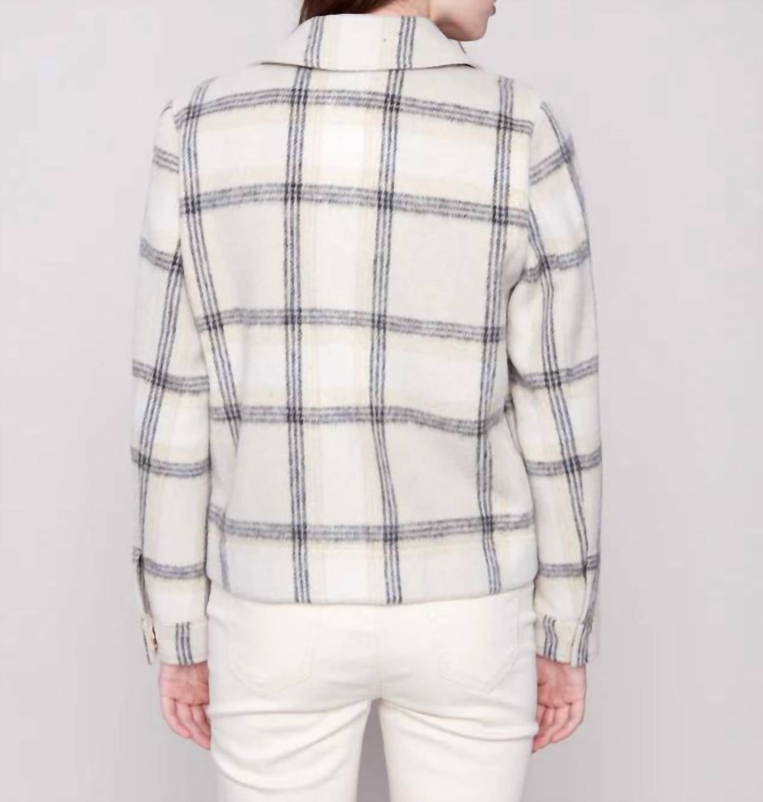 Cute, casual, and comfortable. This jacket is a must have. Introducing the Lurex Plaid Short Jacket by CHARLIE B, a chic beige piece that epitomizes preppy elegance. Featuring long sleeves and crafted from a cozy blend of 50% polyester, 30% wool, 15% acrylic, and 5% viscose, this jacket offers comfort and warmth. With a back length of 23.5 inches, it is designed with a tailored collar and hidden snap button closure for a polished look. Care for this piece by washing on a delicate cycle in cold water, do not bleach, hang to dry, iron at a low setting, and dry clean if needed.