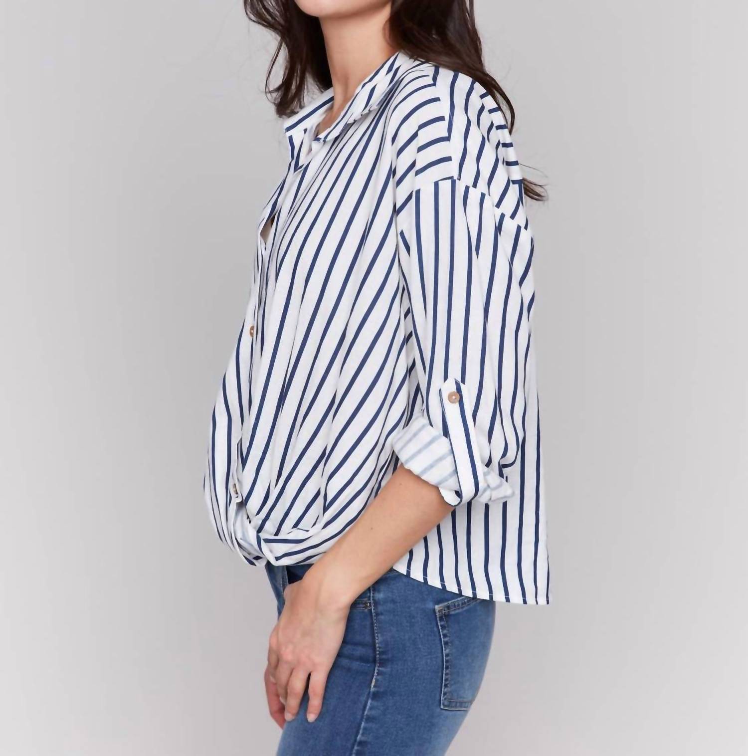 A classic button down shirt that will never go out of style. Elevate your spring wardrobe with the Striped Roll Up Long Sleeves Blouse from CHARLIE B. This stylish piece, featuring a front twist design, is crafted from a linen blend, comprising 55% linen and 45% rayon, offering both comfort and breathability. With a garment back length of 23 inches, it has a classic button closure and distinctive striped pattern, making it perfect for workwear or vacation. Care is simple: machine wash on a delicate setting in cold water, avoid bleach, hang to dry, and iron at a low setting if needed.