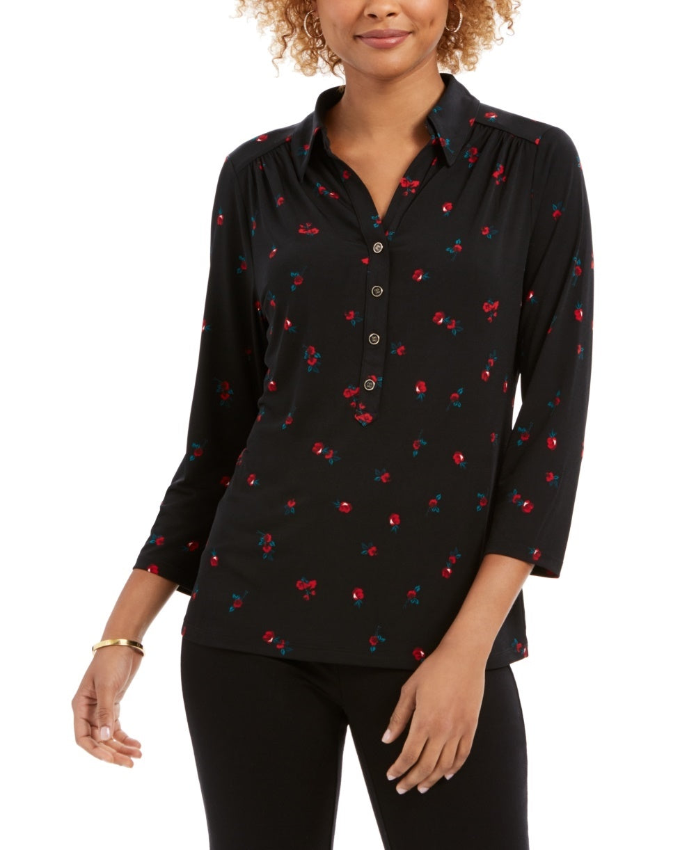 Charter Club Women's 3/4 Sleeve Printed Polo Top Black Size X-Small