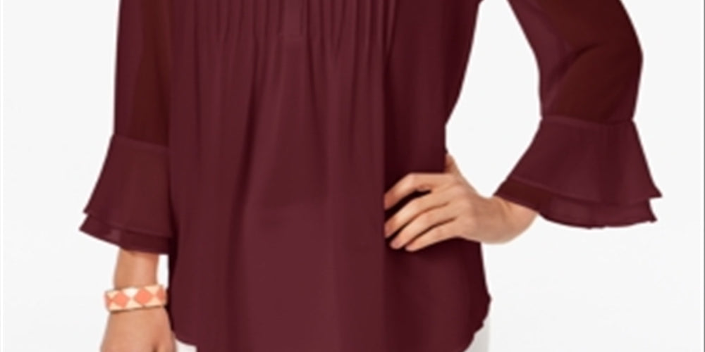 Split neckline |Pintuck pleating at the yoke| A perfect contrast to the flowing feel | Ruffled 3/4-length sleeves