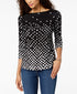Hits at hip | Boat neckline; three-quarter sleeves | Allover print; button embellishments at shoulders