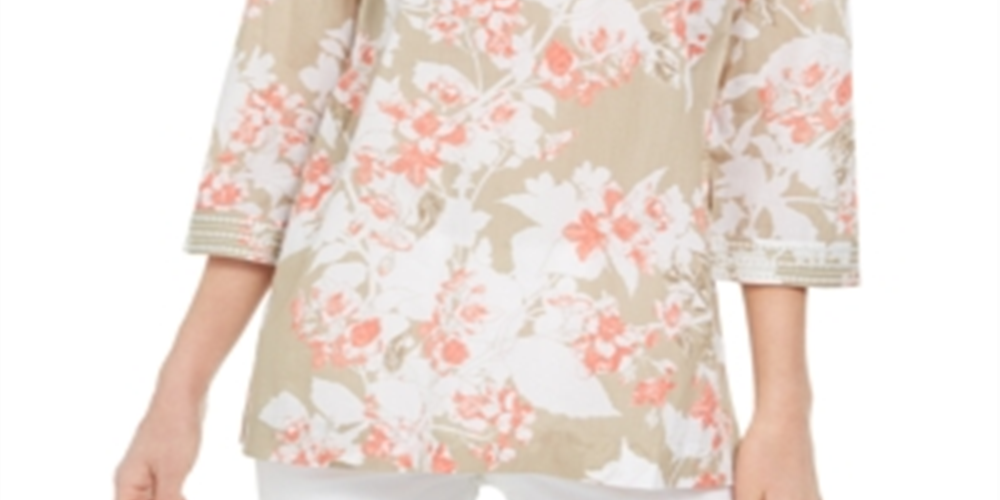 Charter Club Women's Printed Embroidered Voile Linen Blend Tunic Brown Size Small