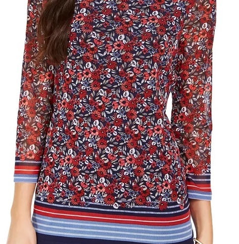 Charter Club Women's Sheer Sleeve Floral Print Top Medium Red Size Small