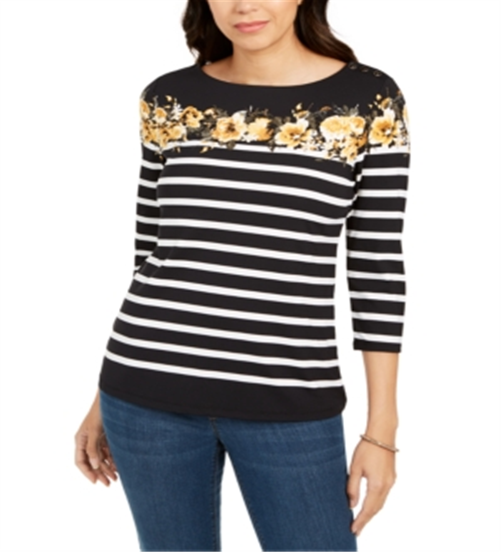 Charter Club Women's Striped and Floral Print Top Black Size Small