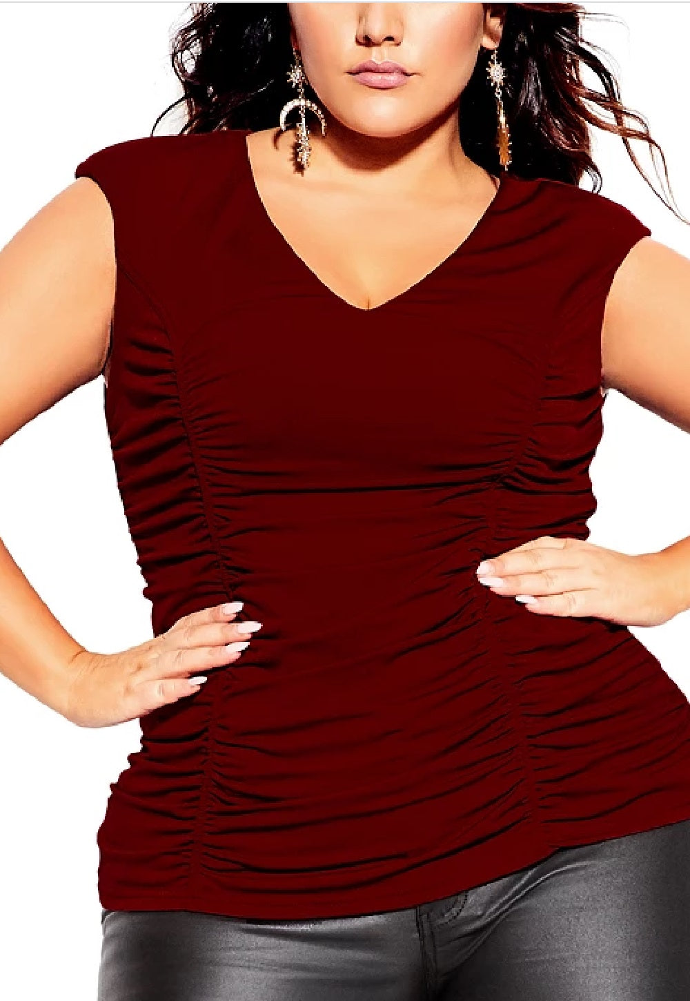 Approx. 24" long|Deep V-neck|Ruched throughout|Please note that this item has International Sizing. Please see US Sizing Conversions noted here that will appear on the merchandise tag when received: 14W= XS, 16W = S, 18W = M, 20W= L, 22W, = XL, 24W = XXL.|ABOUT THE BRAND:|City Chic is a premium Australian fashion brand dedicated to leading a world of curves through bold, sexy, glam & chic fashion. Cut for an hourglass figure to conceal & reveal in all the right places.