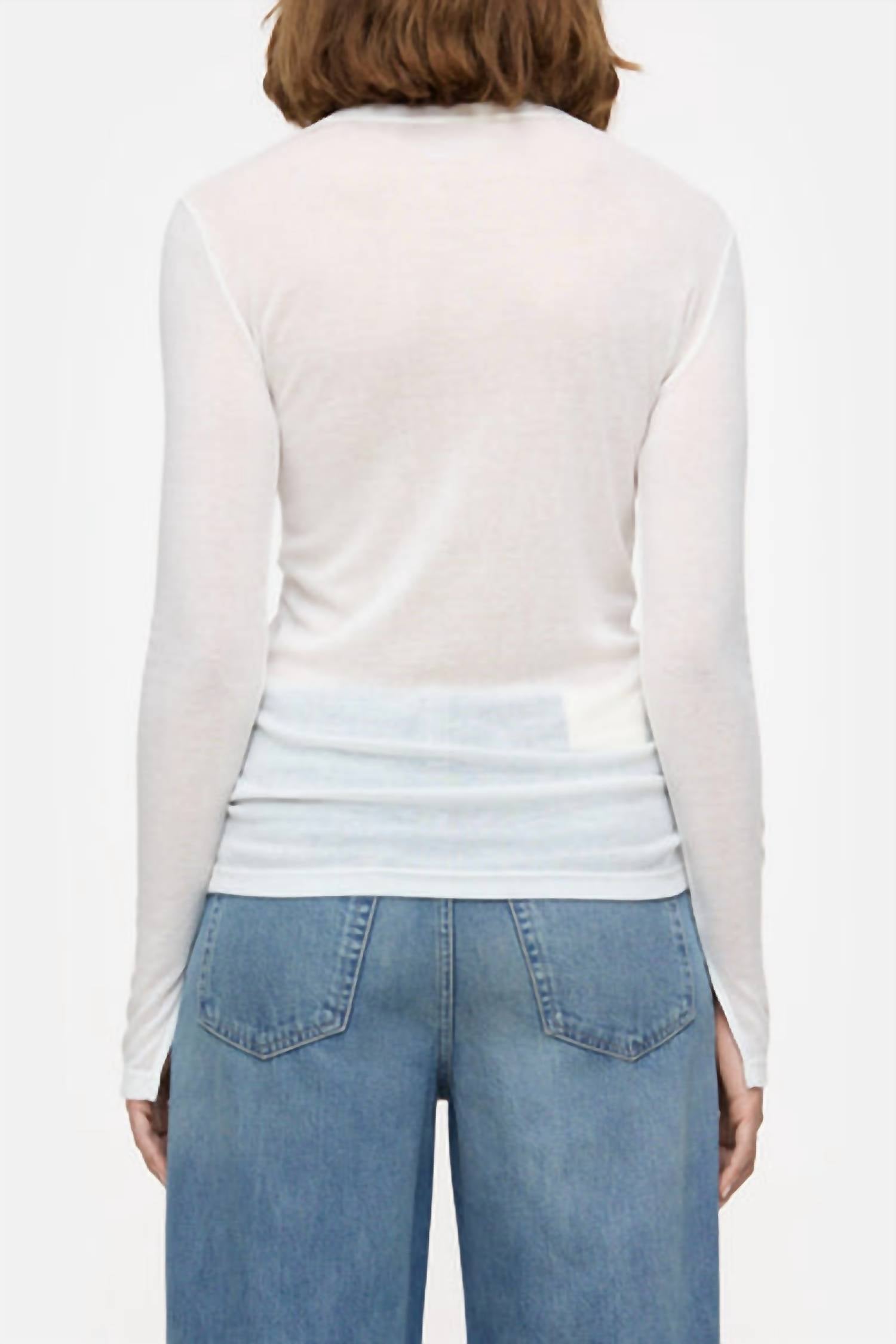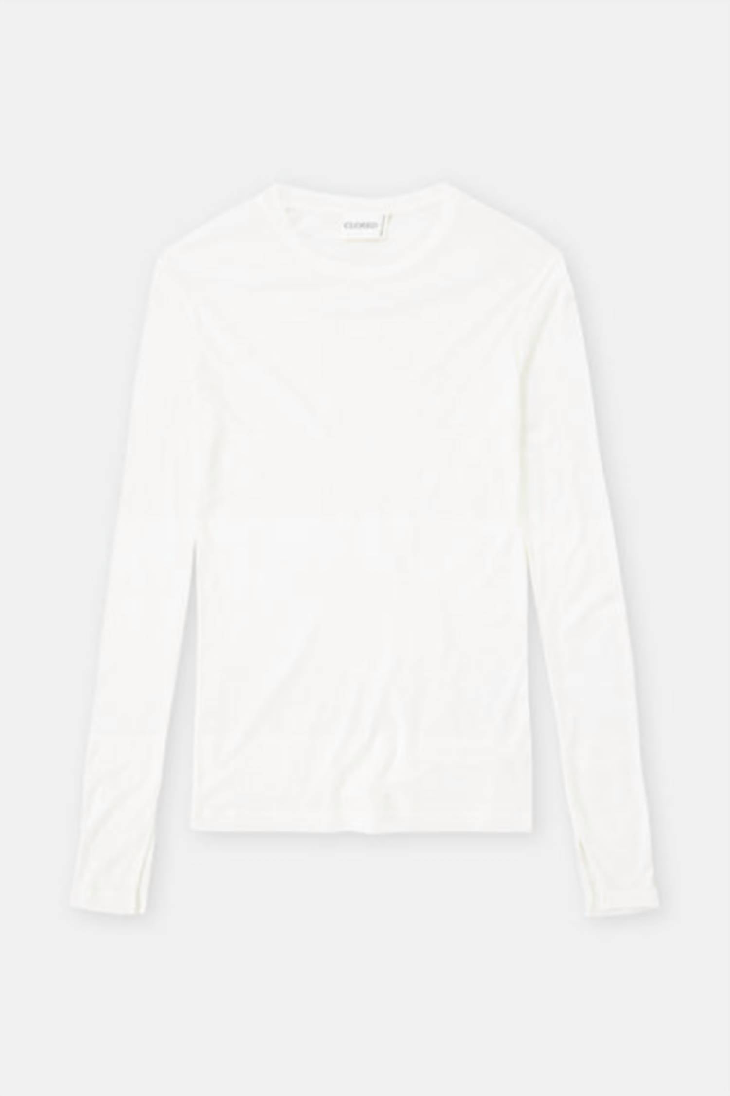 The perfect long sleeve tee that goes with just about anything. Discover elegance with the Crew Neck Long Sleeve Top by CLOSED in a sophisticated ivory hue. Crafted in Portugal from a luxurious lyocell and wool blend, this slim-fit top offers a soft, warming feel with a textured, semi-sheer fabric. Long sleeves with slits at the ends and a clean crew neckline add a touch of refinement. With a garment length of 26 inches, it's a versatile staple for any wardrobe. Hand wash.