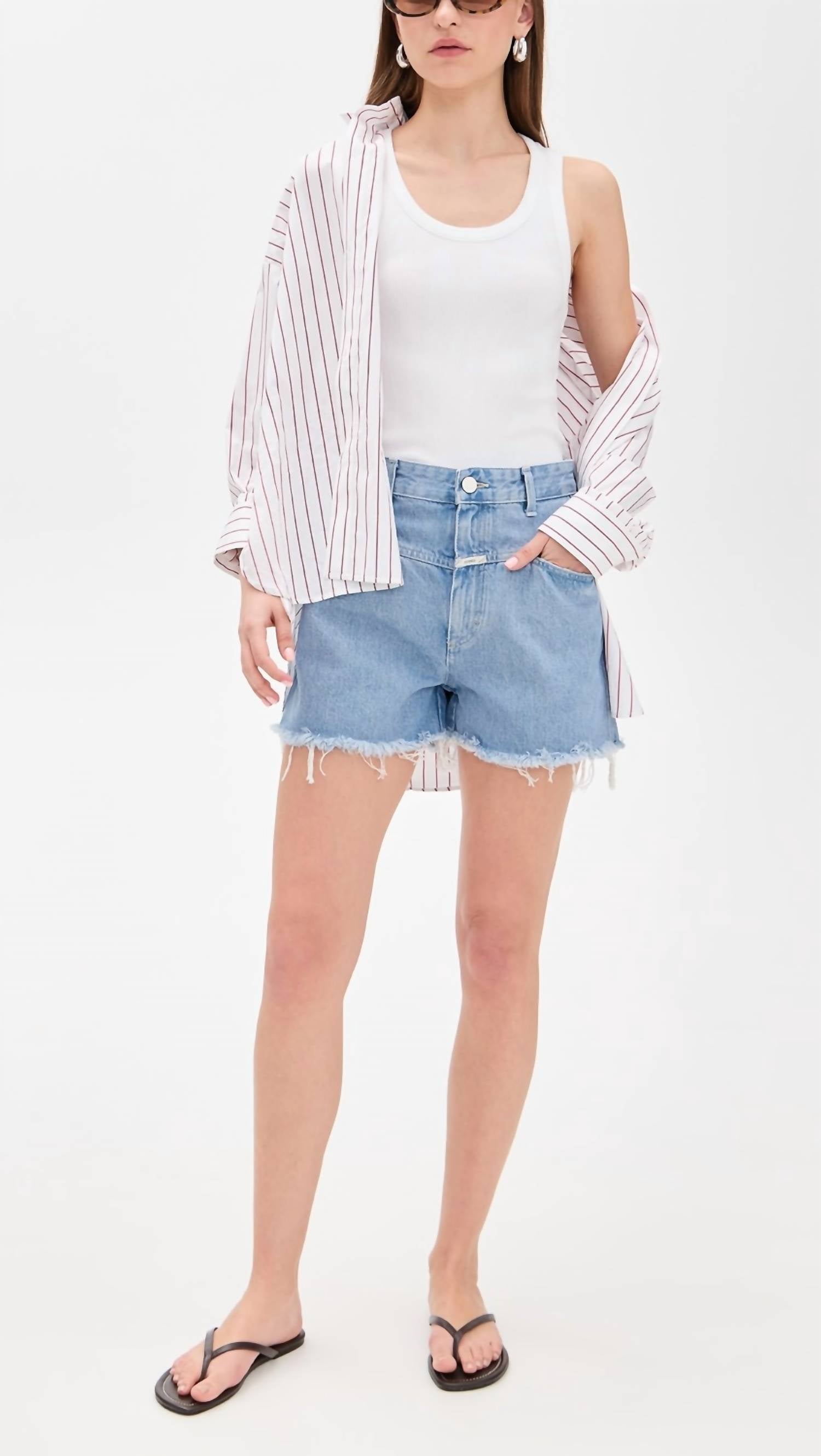 Tuck your favorite tee into these high-waist shorts for a more casual-cool feel. Discover the Jocy Denim Shorts by CLOSED, a must-have in a light blue wash for every casual wardrobe. These women's shorts feature a high waist and wide legs with an open hem for a relaxed look. Crafted from strong, authentic rigid denim with a composition of 100% cotton, they are made in Italy and include X-pockets for added style. The button closure with a zip fly ensures a secure fit, and for easy care, simply machine wash cold. Inseam measures 3.25 inches.