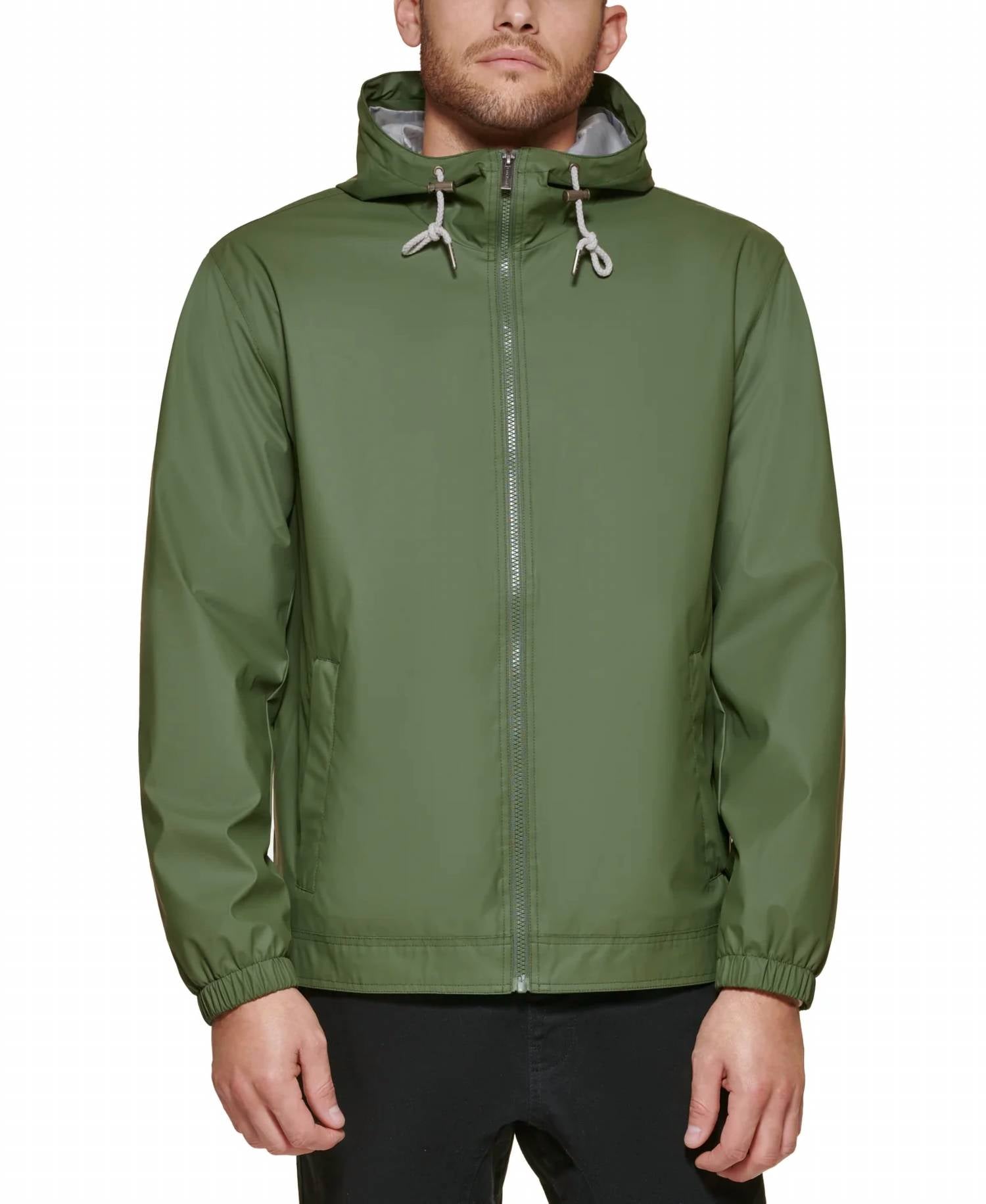 Stay protected and stylish with the Club Room Men's Bomber Jacket With Hoodie in a striking green color. Designed with long sleeves and a rubberized finish, this jacket features a water-resistant polyurethane outer shell that is perfect for unpredictable weather. With a center front zip closure and an attached adjustable hood, it offers practical protection while maintaining a lightweight feel for warmer climates. It includes two hand pockets with zippers, one interior safety pocket, and elastic cuffs for enhanced comfort, and is machine washable for easy care.
