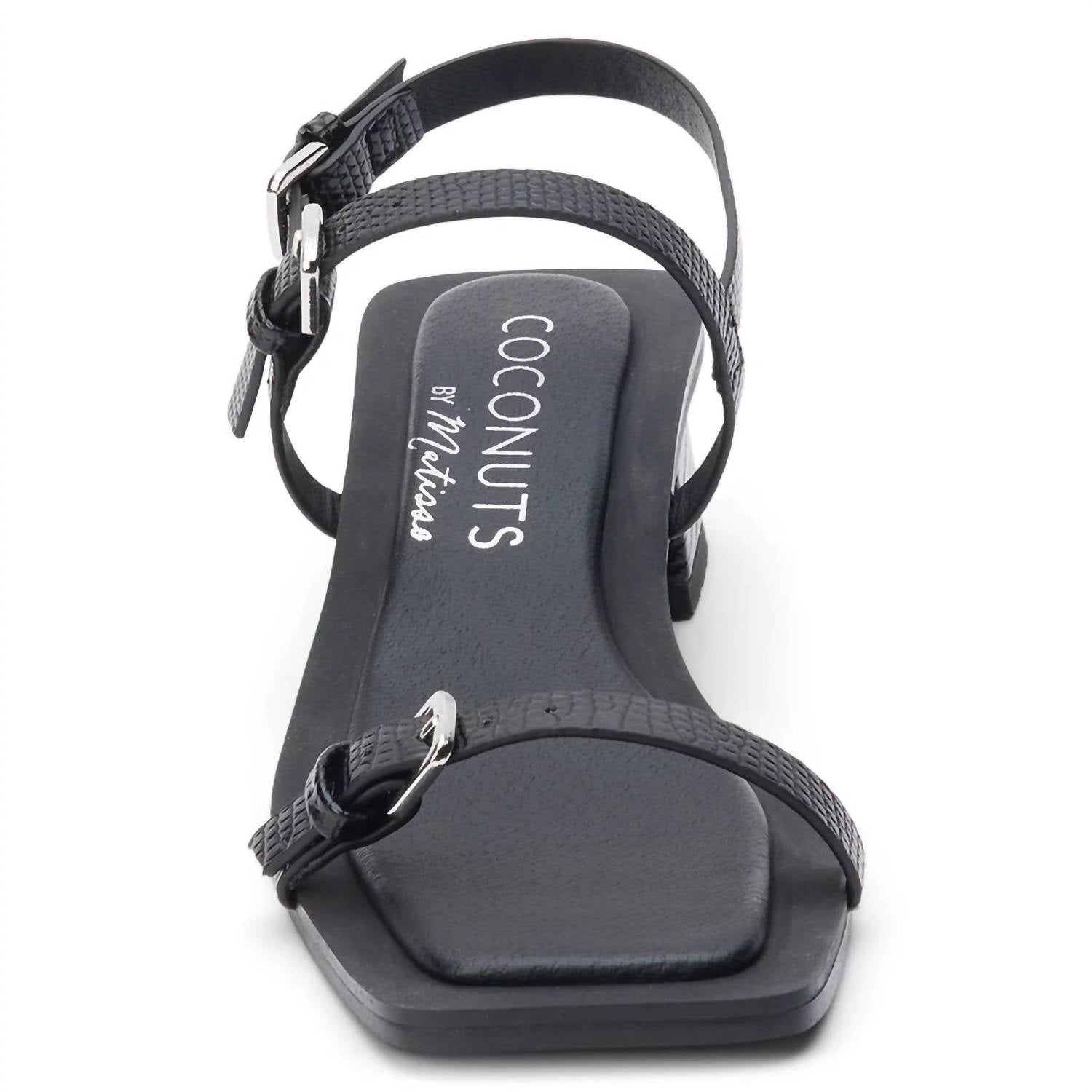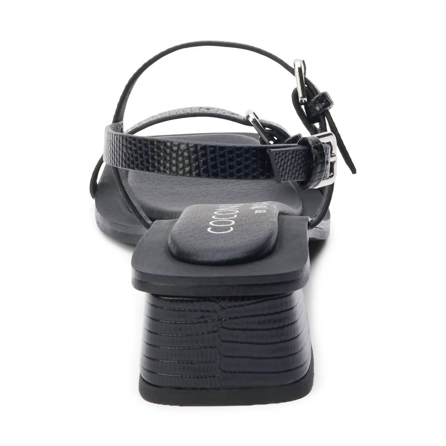 This sandal will take you from brunch to dinner and everything in between.Vegan, strappy sandal with buckle detail and inset heel. Synthetic leather upper. Manmade outsole. 1.75 inches / 4.45 cm heel. Textile lining. Padded insole. Imported.