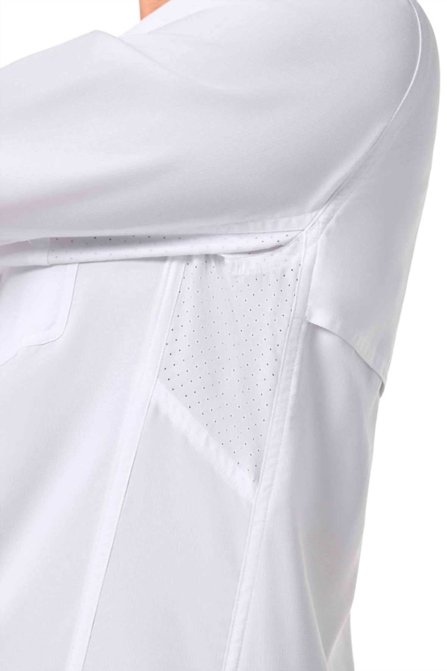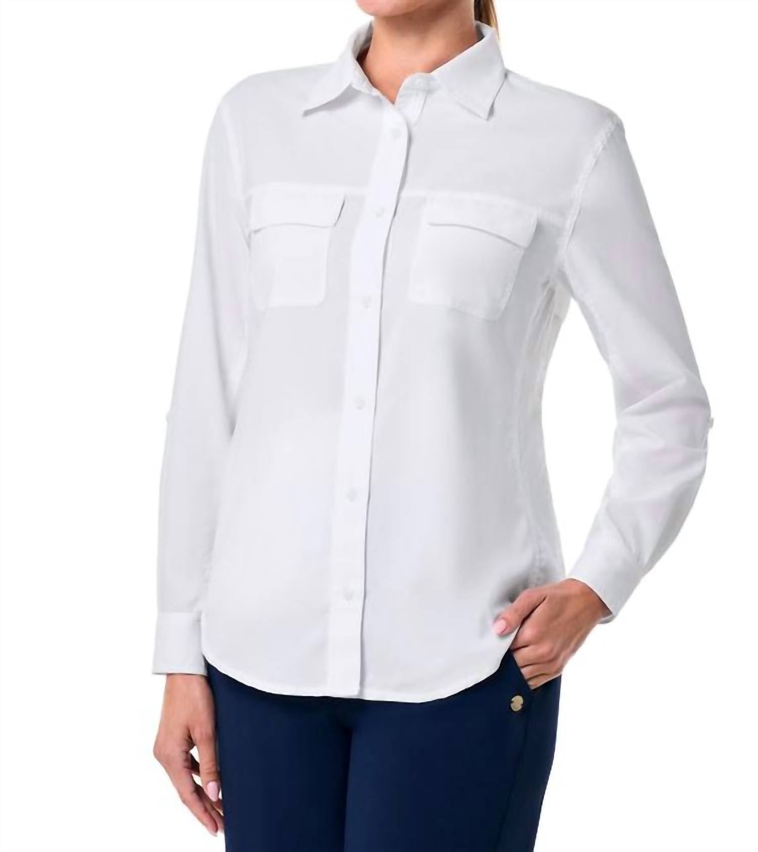 This button down shirt is comfortable yet polished. Meet the COOLIBAR Mylitta Travel Shirt, expertly crafted for the adventurous woman on the go. This long sleeve shirt in solid white features roll-up sleeves with button tabs and flap chest pockets with a hook and loop fastener. The innovative 3Ddri™ fabric, made of 100% polyester, promotes effective moisture wicking with its lightweight, breathable design while providing UPF 50+ sun protection. Closure: Button closure. Care: Hand wash and lay flat to dry.