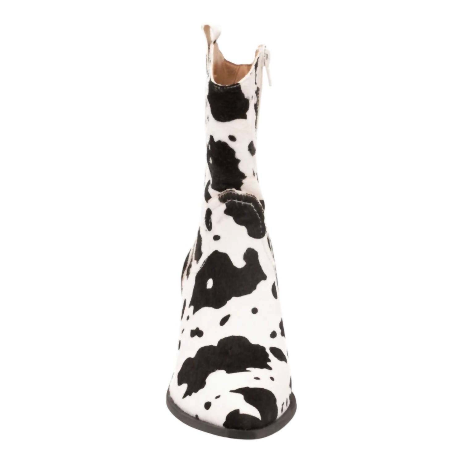 Adventurous choice in ankle boots that dares to stand out. Crafted from leather and embellished with a striking black cow print. Combines bold style with faux hide detailing. Designed with a pointed toe. Boasts a chic 3" block heel to elevate your western-inspired look.