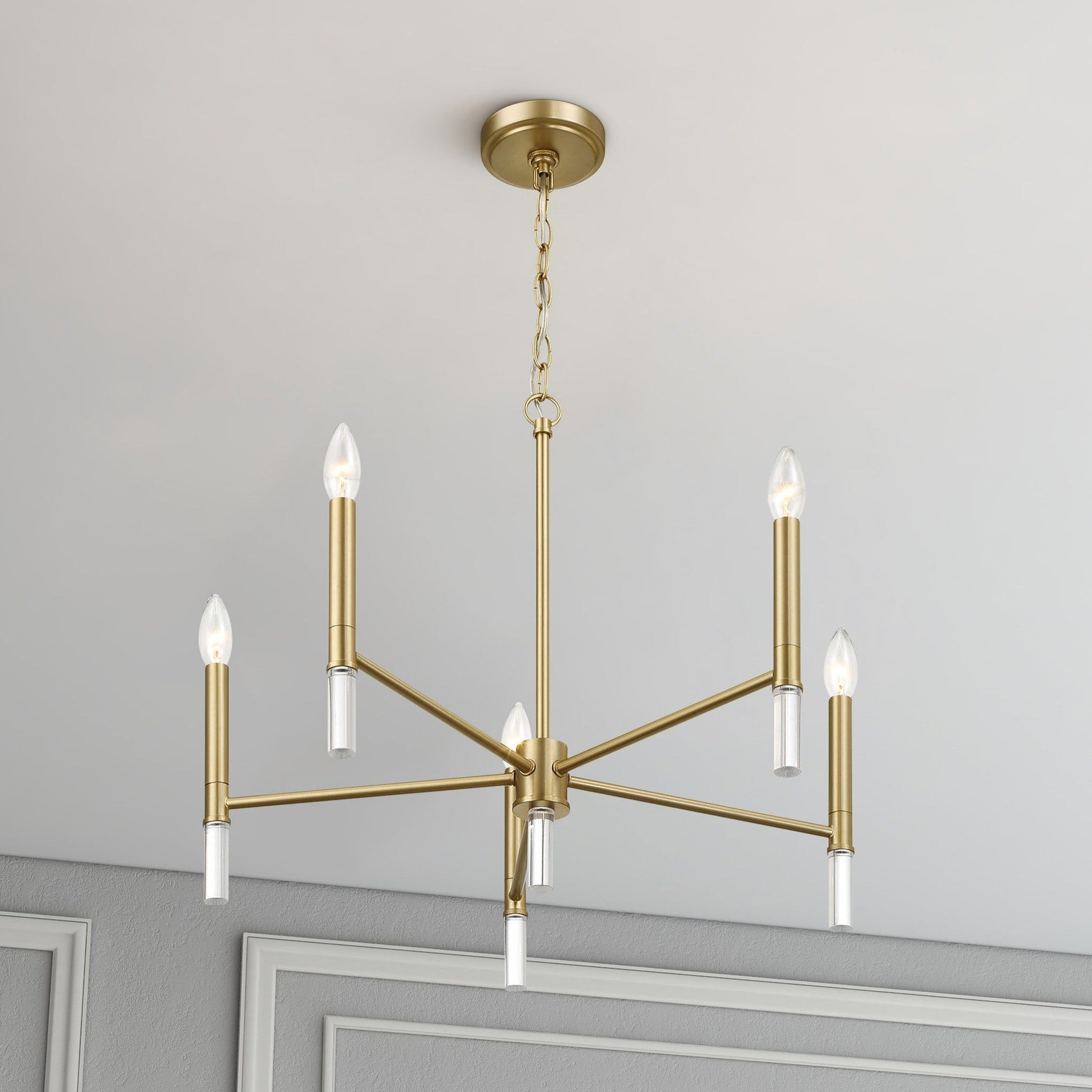 The Courtyard Five Light Chandelier features a refined golden brass finish with candle-style lights, designed to complement dining rooms or living spaces with a warm and inviting ambiance.