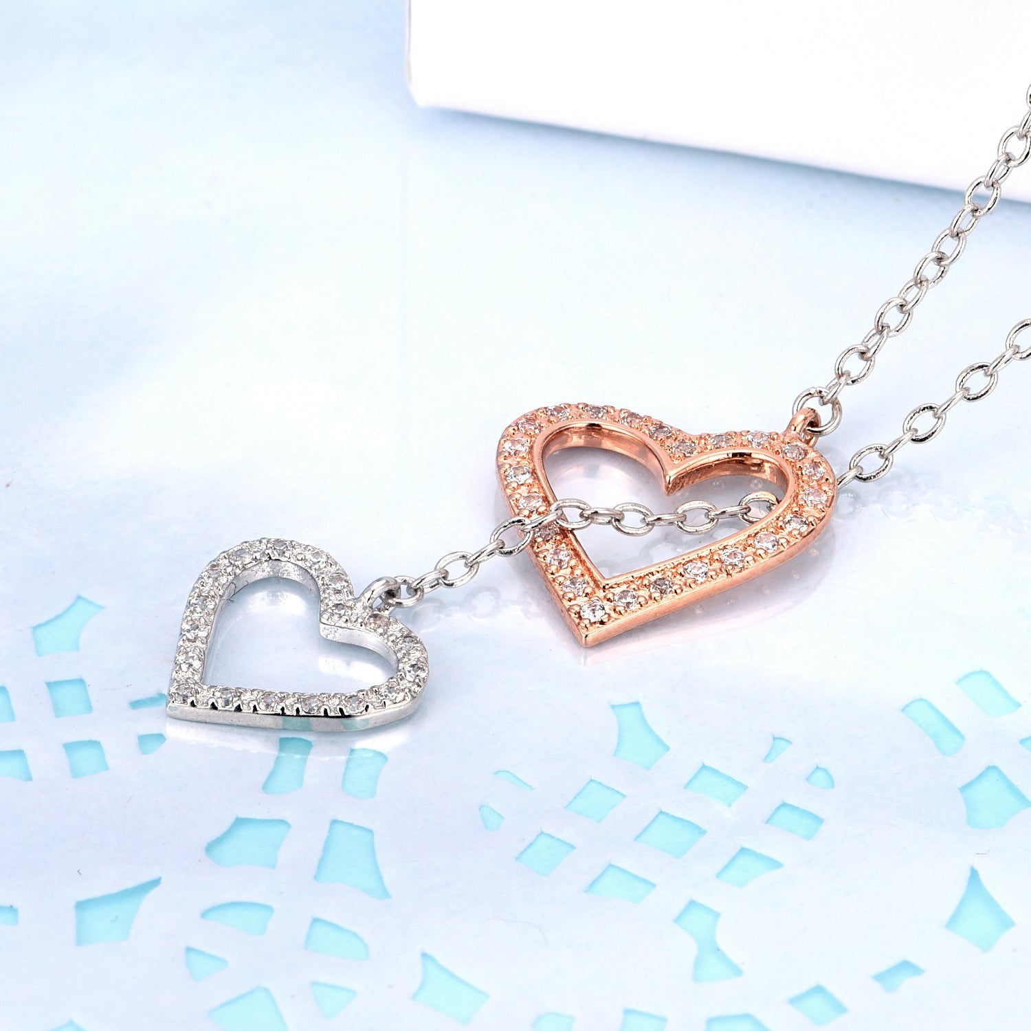 The necklace features two interlocking heart pendants, each adorned with sparkling cubic zirconia stones that add a touch of glamour and sophistication to the piece. The cubic zirconia stones are expertly cut and set in a pave setting, creating a dazzling display of sparkle and shine.