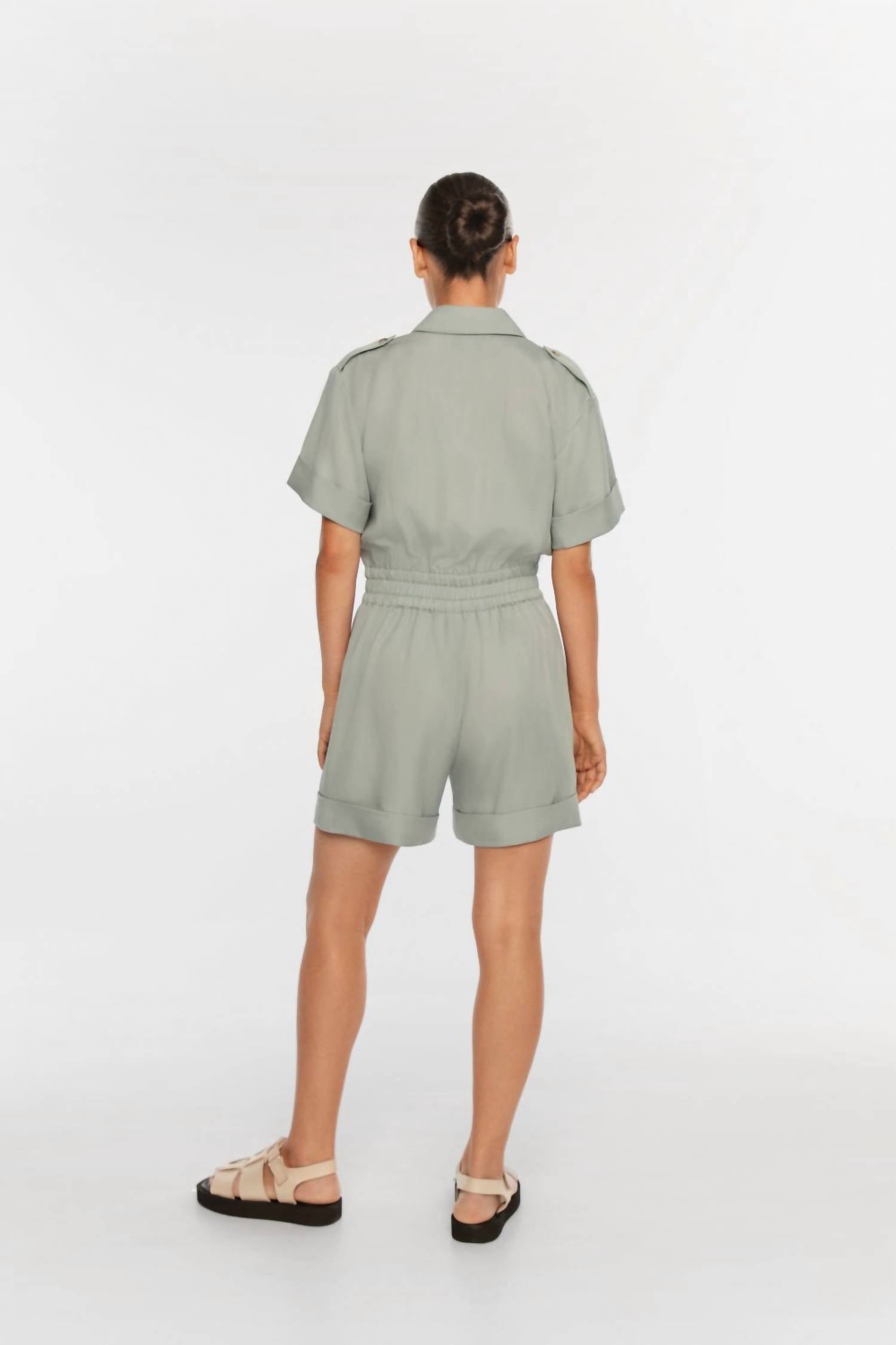 The perfect outfit choice when you you need something quick to throw on and still want to look efforlessly cool. Meet the Technical Twill Playsuit by Dāl the Label, an effortless piece in Mist perfect for a minimalist style. This playsuit is crafted from TENCEL™ Lyocell Twill and features cuffed shorts with shoulder buttons, front flap pockets, and a structured shirt collar. The adjustable tie cotton rope at the waist adds a flattering detail, complemented by a hidden zip closure for convenience. Care instructions recommend dry cleaning to maintain its quality.
