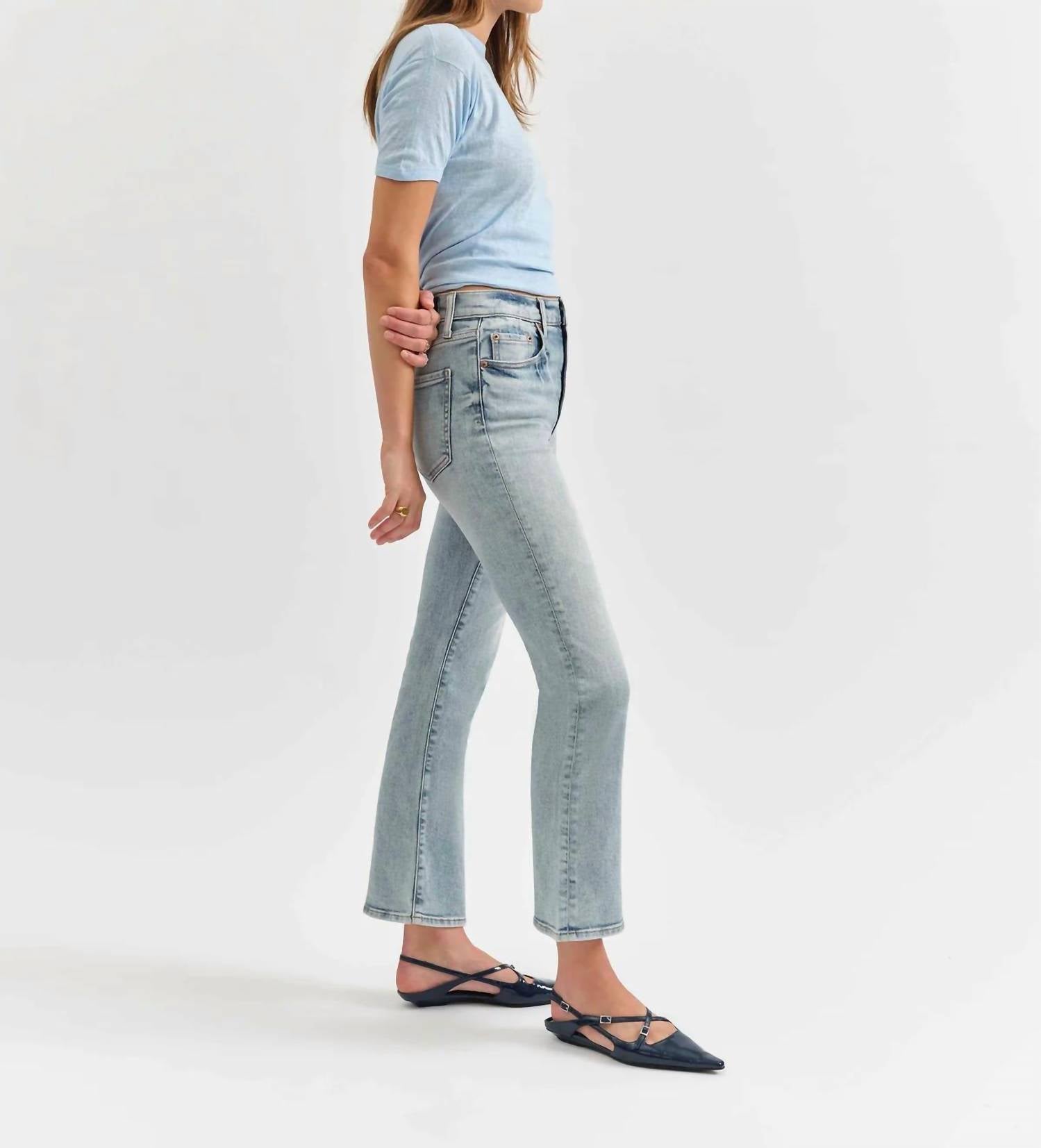 A flattering silhouette that's suprisingly versatile. Introducing the Shy Girl Crop Flare Jeans by DAZE, a statement piece in Miracle light wash for your streetwear collection. Featuring a flirty mid-rise and a cropped 26" inseam, these jeans are designed with a slim fit and flared leg, complete with a 16 1/4" leg opening. Made from a comfortable stretch fabric composition of 93% cotton, 5% polyester, and 2% spandex, this solid-patterned jeans offer both flexibility and a flattering silhouette. They are secured with a button closure and feature convenient pockets. Care instructions suggest machine wash cold and tumble dry to maintain the quality of the piece.