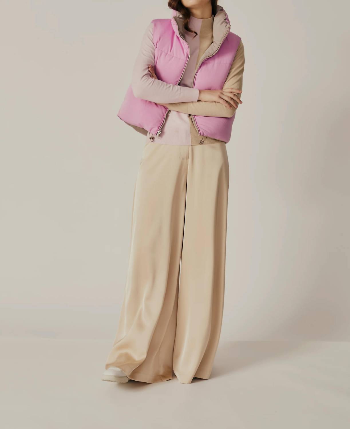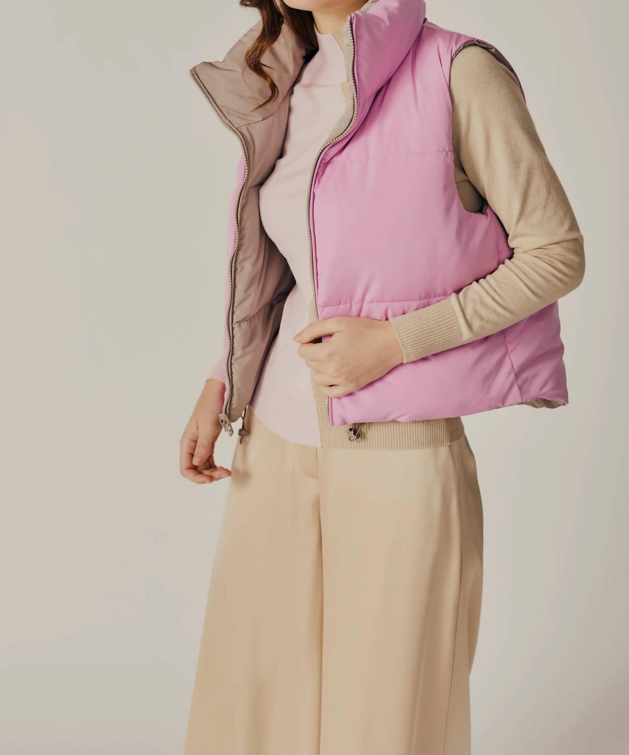 Introducing the Kansas Reversible Puffer Vest by DELUC, an essential addition to your winter wardrobe in a striking Pink/Mink solid color. This women's sleeveless vest offers a high neck collar design with a relaxed fit and front in-seam pockets. Made from synthetic fabric, it features a convenient front zip closure and an adjustable hem with elastic drawstring and stoppers for a customized fit. Perfect for the holiday season, this versatile vest keeps you stylishly warm.