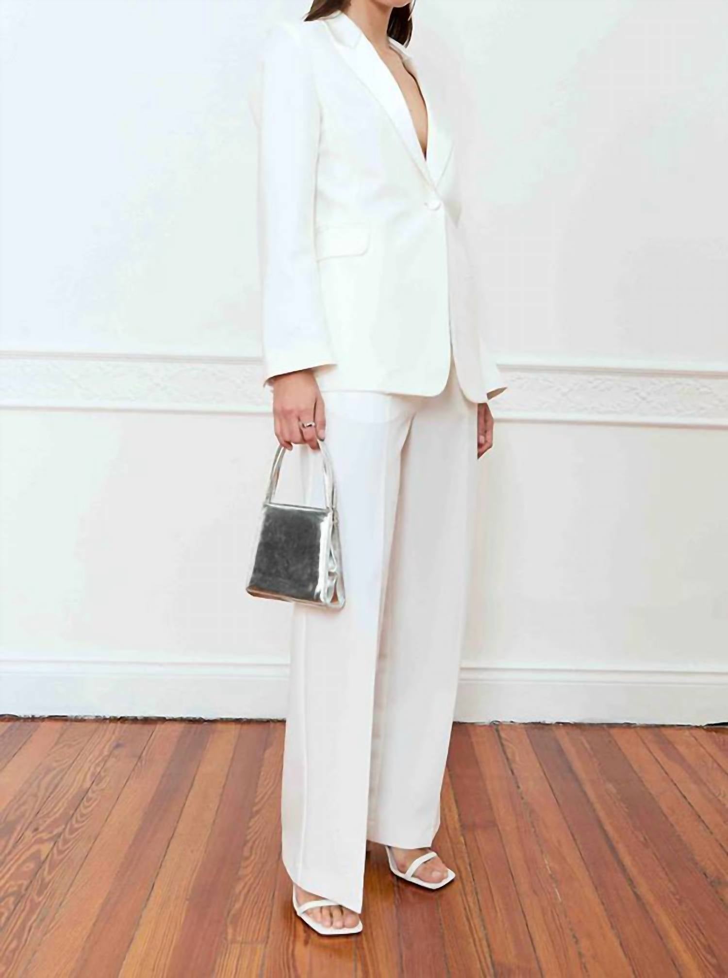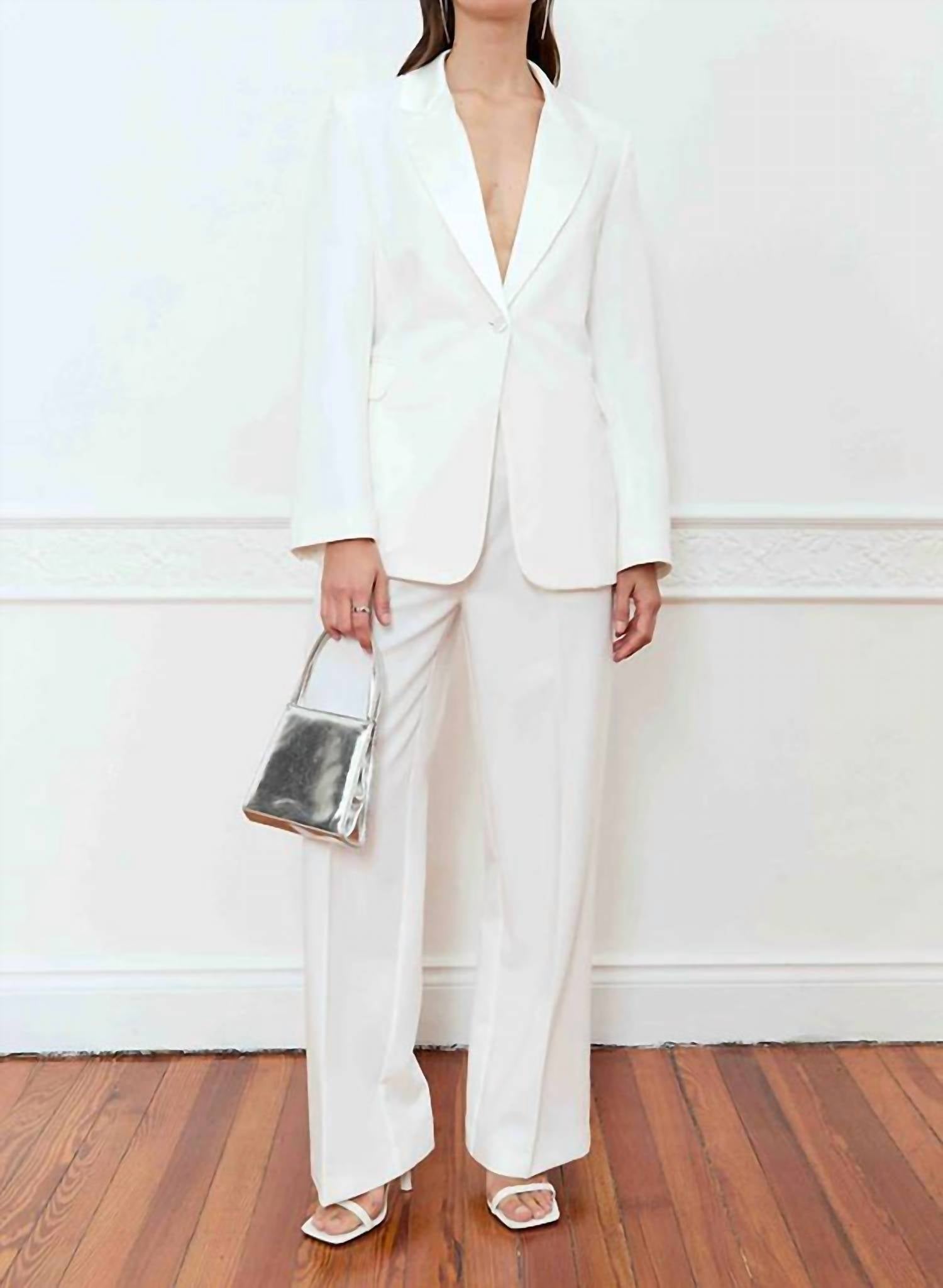 Offering a touch of sophistication in a chic off-white hue. Long sleeve blazer. Crafted from 76% Polyester, 18% Rayon, and 6% Spandex. Features satin lapels and a versatile single button closure. Designed with a slight shoulder pad for added structure. Machine wash cold.