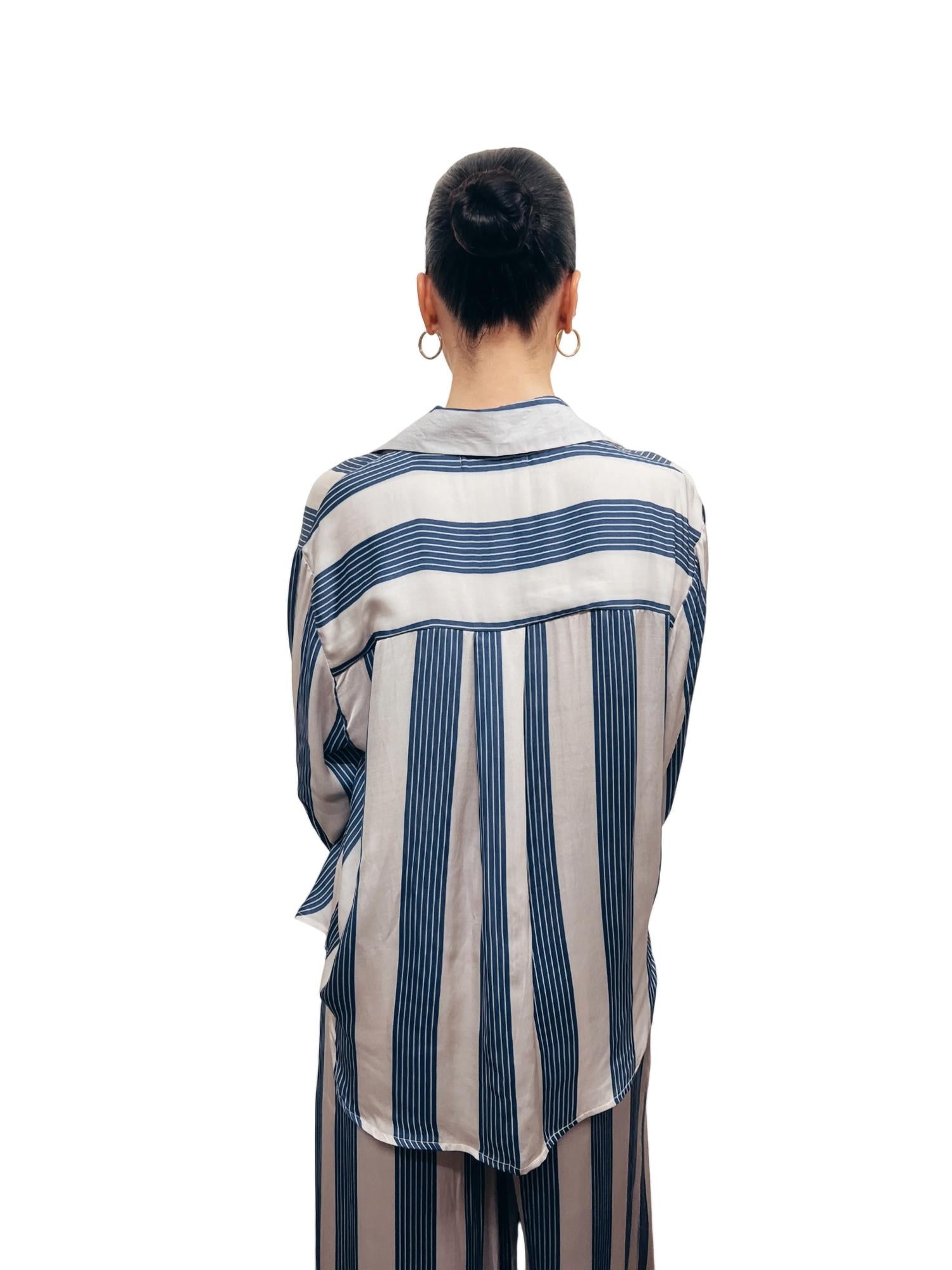 A classic button down shirt that will never go out of style. Experience luxury with the Milo Stripe Shirt by DELUC, a stunning addition to any sophisticated wardrobe. Crafted from 100% viscose in a striking blue and white vertical striped satin design, this long sleeve shirt offers a refined look. The classic collar and button closure complement its elegant aesthetic perfectly. Care is simple with instructions to hand wash, avoid bleach and tumble dry, and iron at low heat. The model is wearing a size small, showcasing the shirt's true size with an intentionally oversized fit.