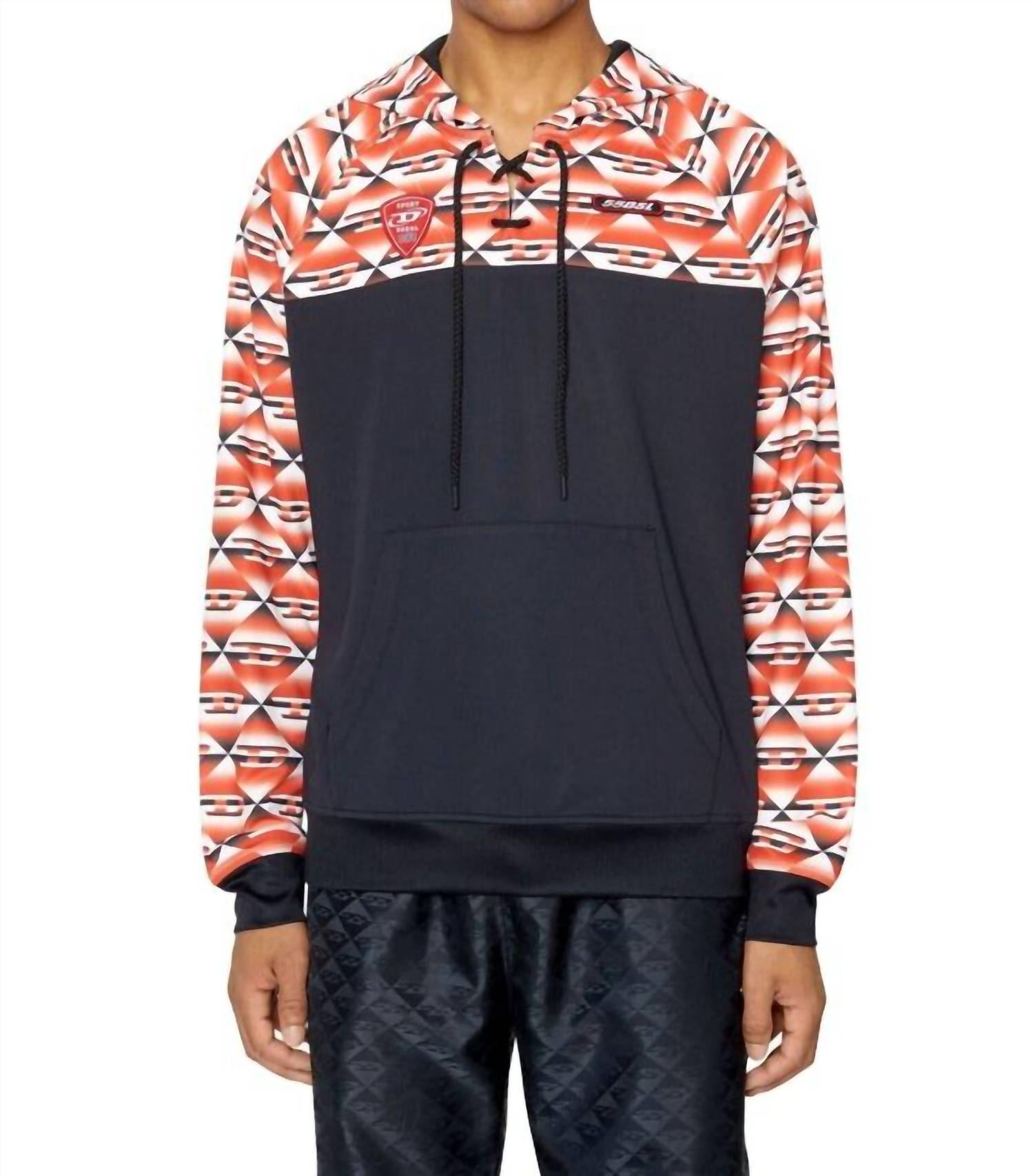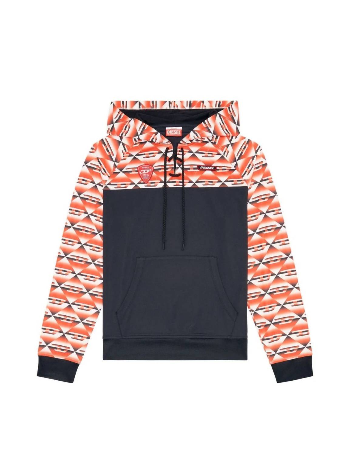 Unveiling the Sport Zonnie Sweatshirt by DIESEL, a sleek addition to your activewear collection. This men's hoodie features long sleeves and is crafted from 92% polyester and 8% elastane-spandex for moisture-wicking comfort. It showcases a patterned design with a distinctive graphic 'D' logo and a lace-up neckline. Closure is pull-on, with convenient pouch pockets and a seamless finish for a streamlined look. Care instructions: Machine wash.