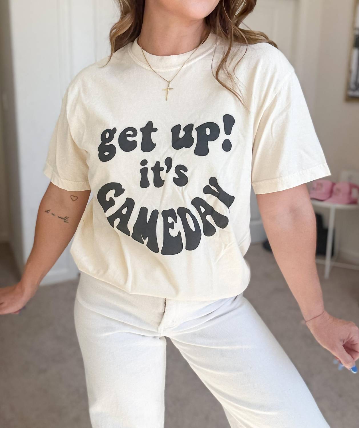 The short sleeve tee you'll want in every color. Show off your team spirit with the "Get Up It's Gameday" Tee from Distressed Vintage Couture, an essential for sports enthusiasts and tailgaters. Designed with short sleeves, this versatile tee offers a comfortable oversized boyfriend fit in a classic cream hue. Crafted from a cotton blend, it features a graphic pattern and a crewneck, and is easy to wear with its pull-on closure. Easy to care for, simply machine wash with like colors and enjoy its streetwear appeal any game day.