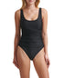 A classic re-imagined| this DKNY swimsuit updates timeless lines with soft shirring and contrast mesh at the sides.| Removable soft cups| Moderate bottom coverage| Pull-on styling; over-the-shoulder straps| Scoop neckline| Open back; contrast mesh stripes at sides; shirred at front