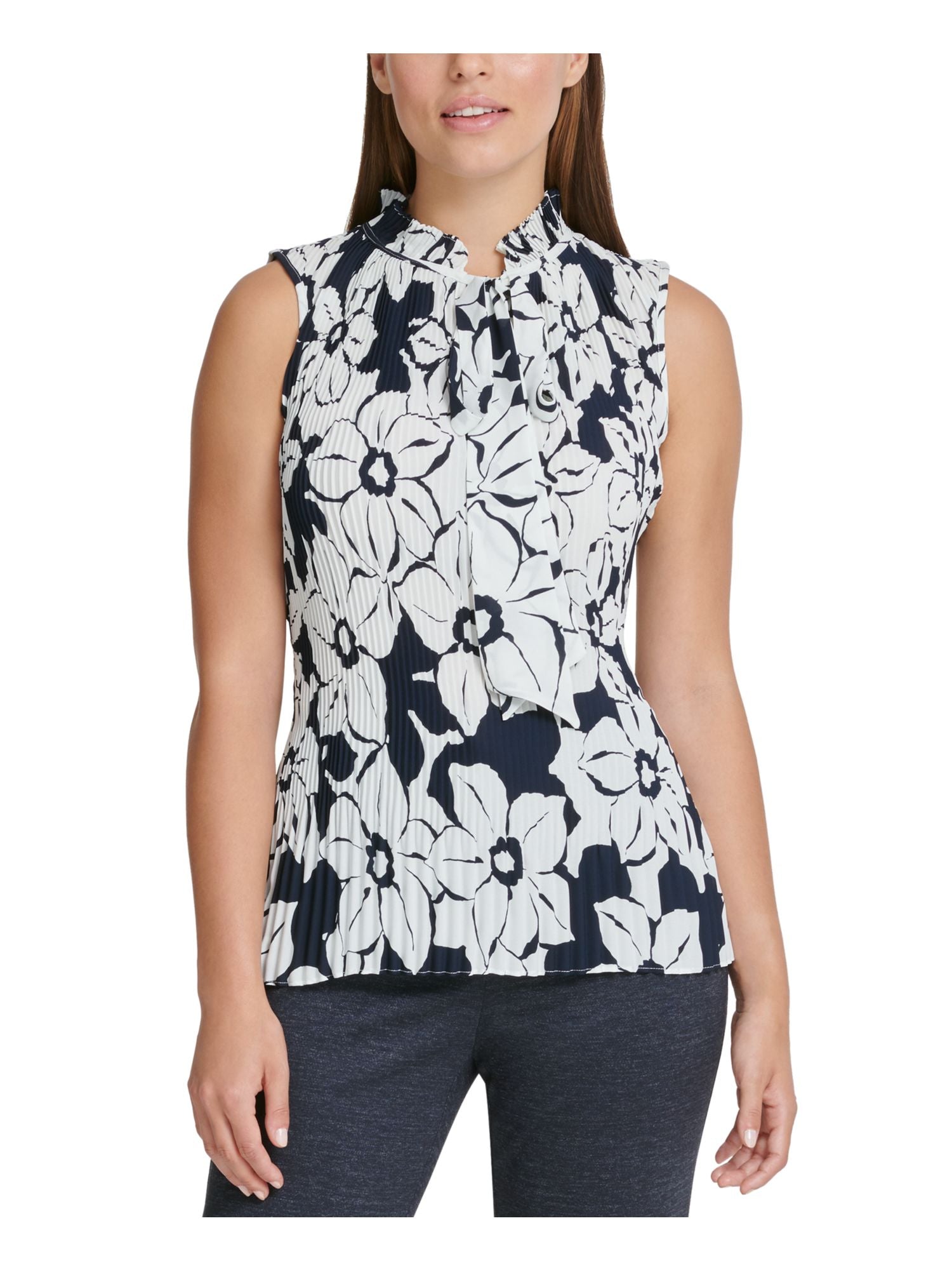 DKNY Women's Pleated Tie Floral Sleeveless V Neck Top Blue Size Large
