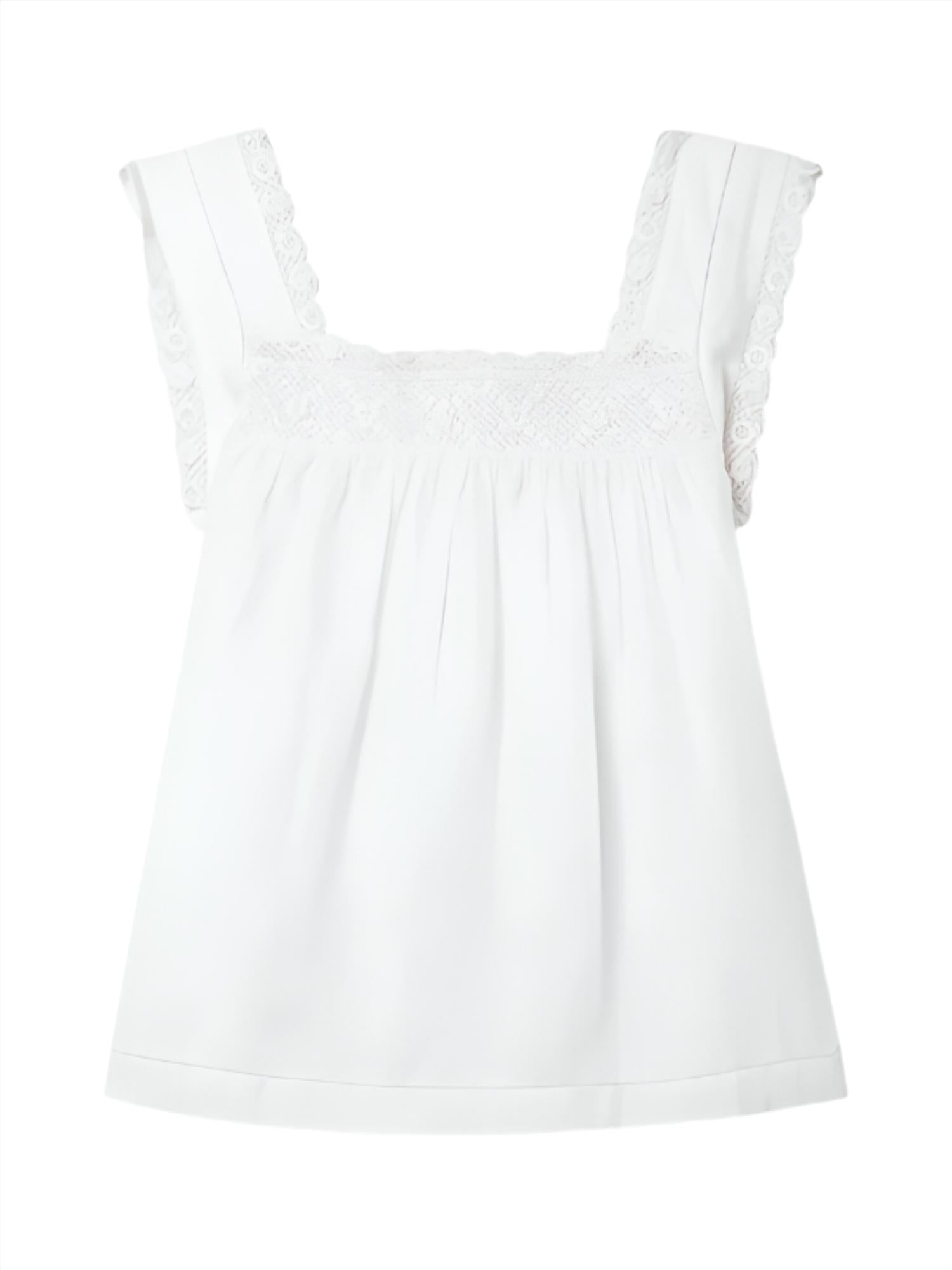 A timeless blouse that will never go out of style. Introducing the Aphra Floral Lace Top by DÔEN, a perfect blend of retro and romantic vibes for your wardrobe. This sleeveless blouse, crafted from 100% organic cotton, boasts a delicate floral lace pattern in a charming salt hue. With a sophisticated squareneck design, it features a pull-on closure for effortless elegance. Made overseas, it requires dry cleaning to maintain its exquisite finish.