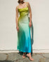 The Satin Ombre Criss Cross Back Dress by DRESS FORUM in Maui Blues features a sleeveless design that exudes elegance and sophistication. Crafted entirely from polyester, this patterned maxi dress is designed with a subtle cowl neckline and an alluring open back, complemented by an adjustable criss cross tie closure. The self-fabric line at the bust provides comfort, while the lining from chest to thigh adds a touch of modesty. For care instructions, machine wash is recommended. Models range from 5'6" to 5'9" in height, each wearing a size small, perfect for New Year's Eve or any evening event.