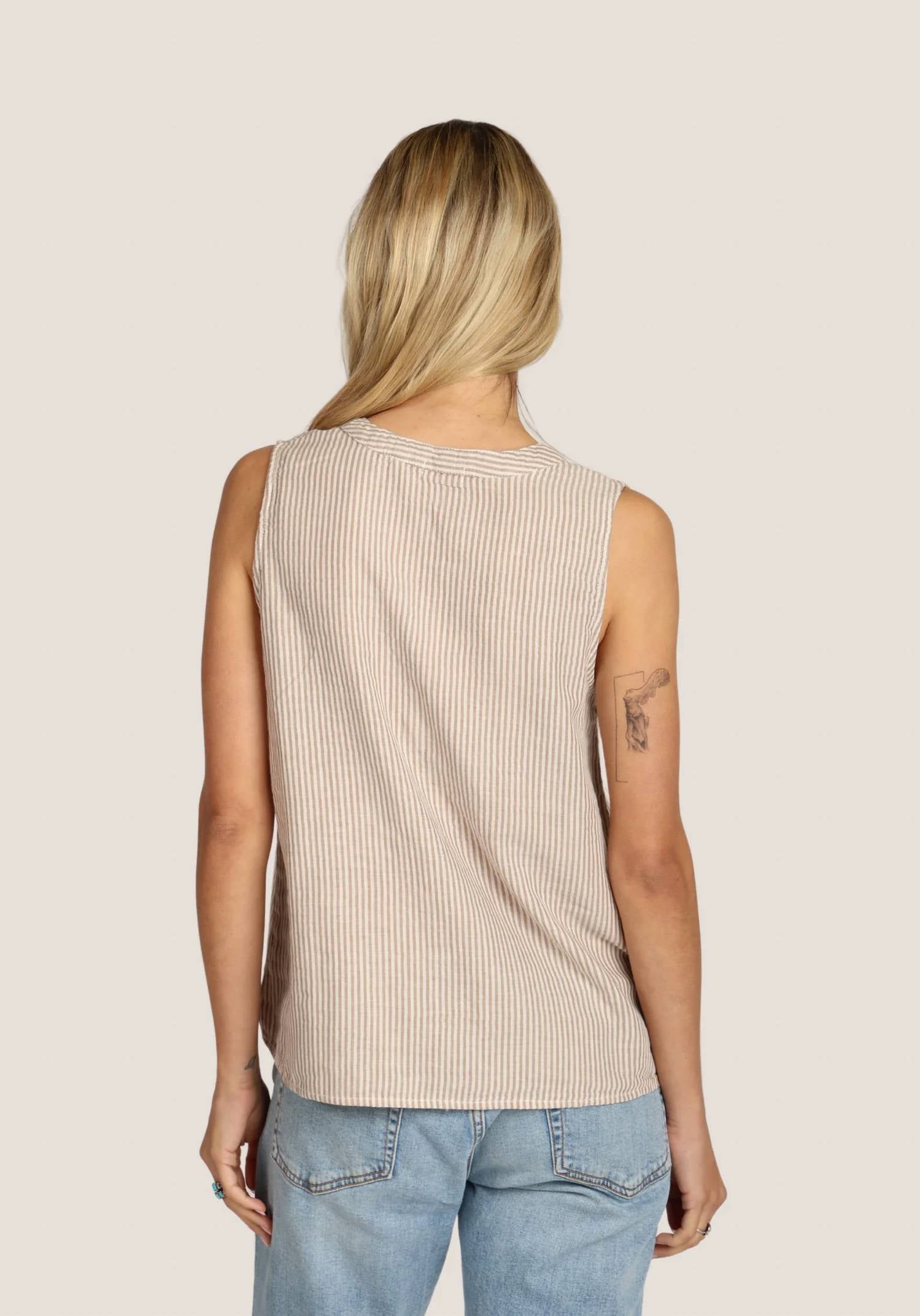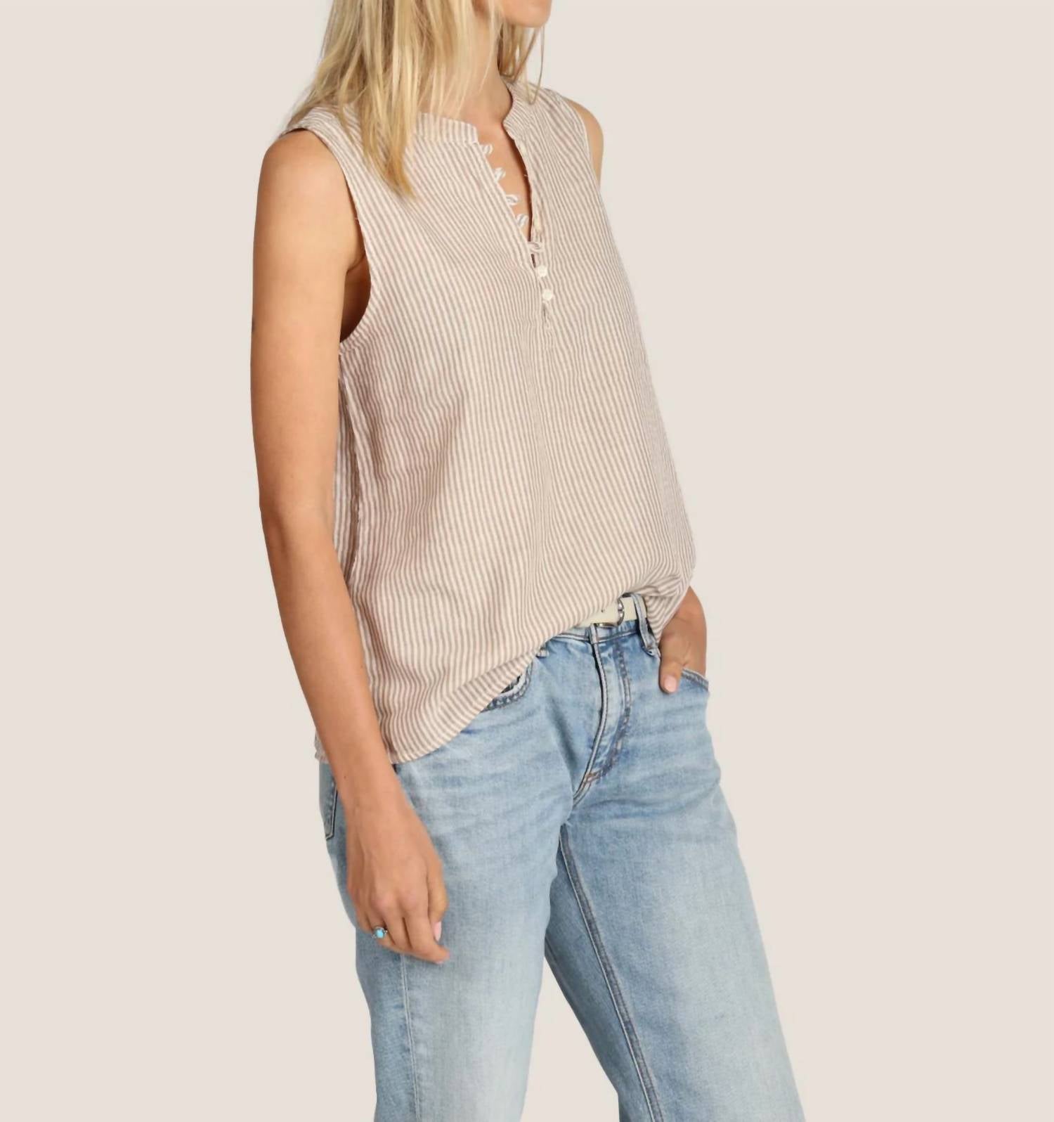 A timeless blouse that will never go out of style. Introducing the A-Line Sleeveless Top by Dylan, a must-have for minimalist summer style. Crafted from 100% cotton, this striped blouse in a chic white and brown palette offers breezy comfort for any dinner party. It features a classic crewneck and a convenient button closure, combining elegance and ease. With its timeless design, this top is perfect for adding a touch of understated sophistication to your wardrobe.