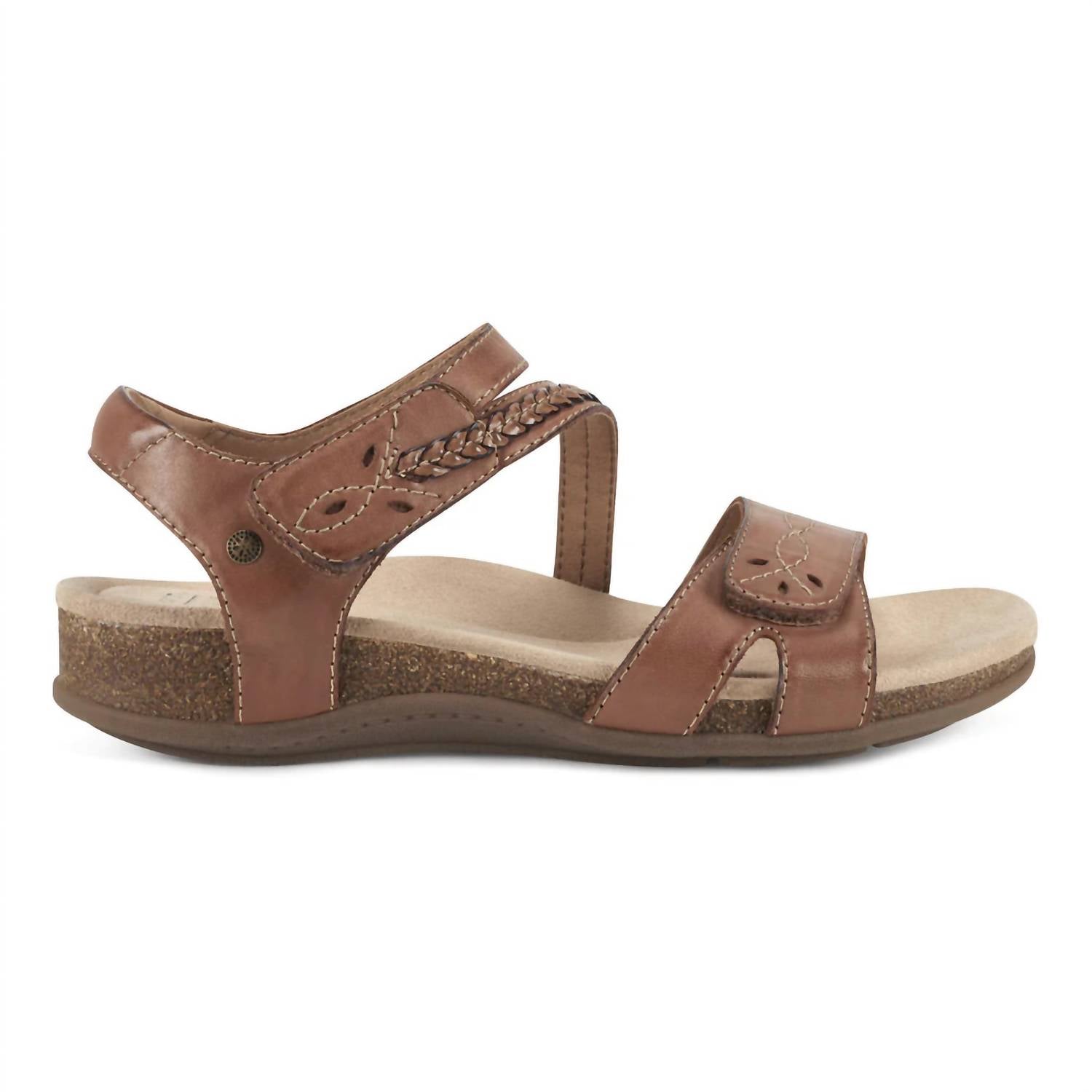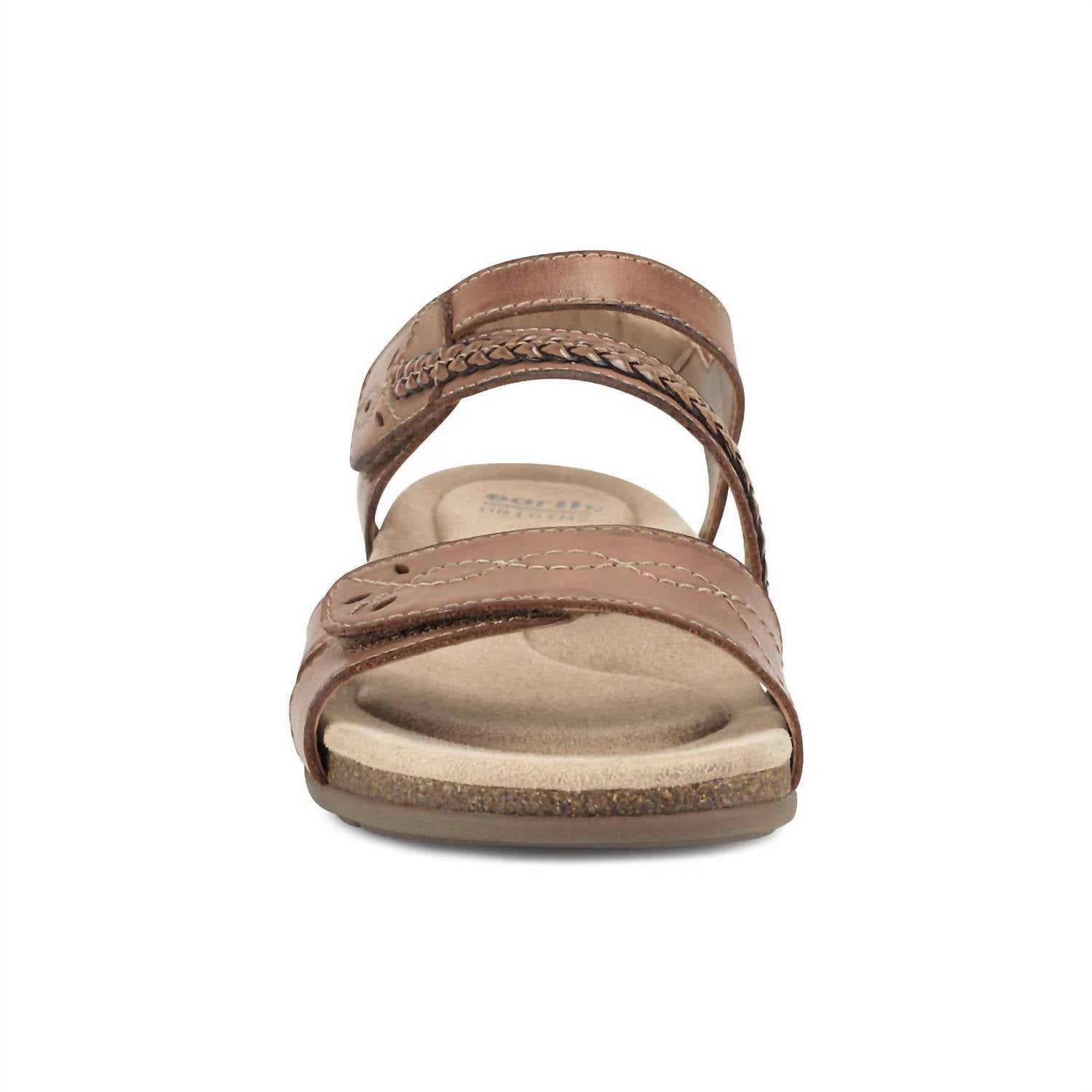 Classicly cute and all-day-wearable. We love this sandal. Step into sustainable elegance with the Women's Bria Sandals by EARTH in Alpaca. Crafted from premium leather, these sandals are designed with two hook and loop adjustable straps for a customized fit and feature a cushioned, memory foam footbed that provides superior arch support. The soft footbed cover, made with 82% recycled plastic bottles, ensures moisture-wicking comfort. With a practical heel height of 1.5" and slip resistance, these sandals are your perfect bohemian-inspired summer staple.