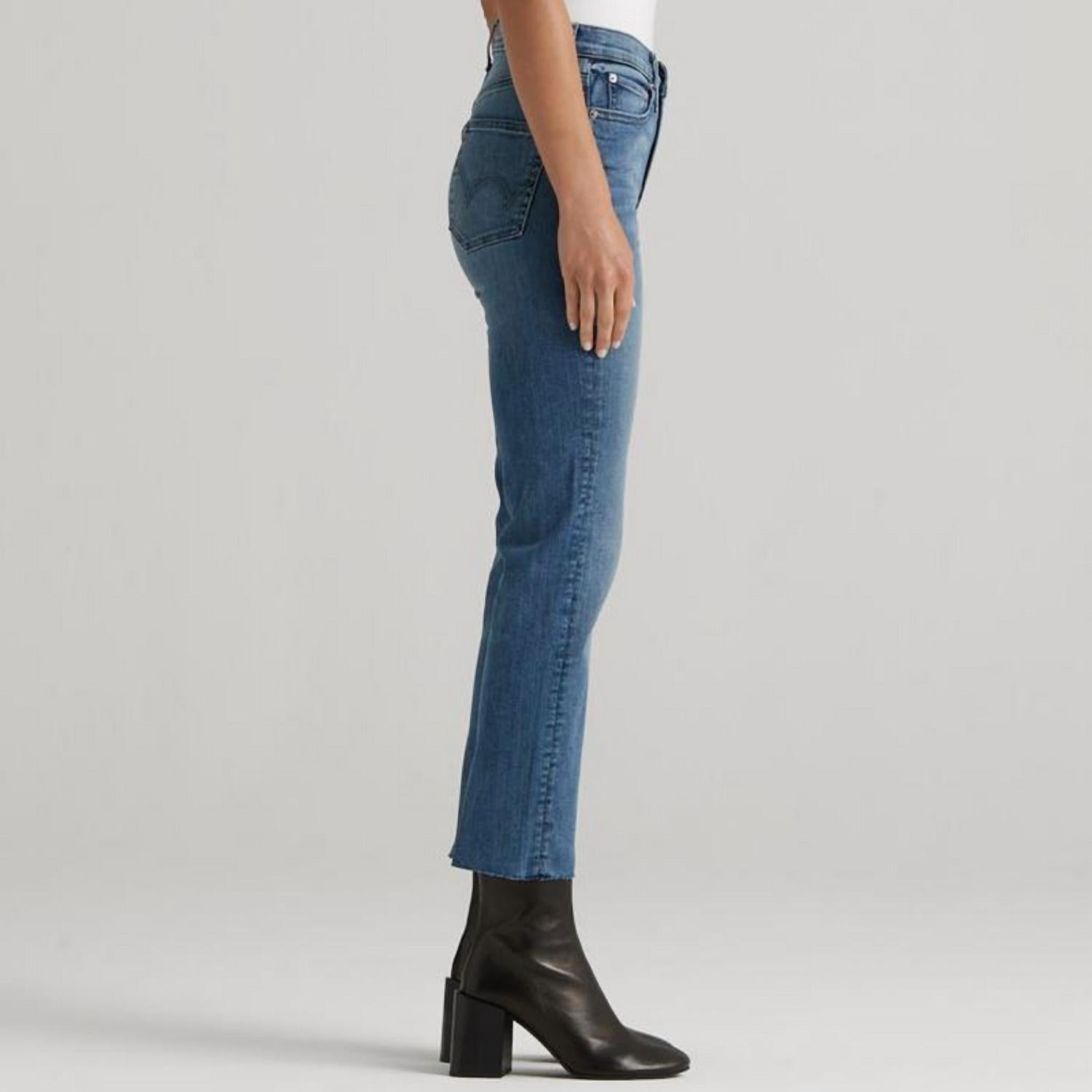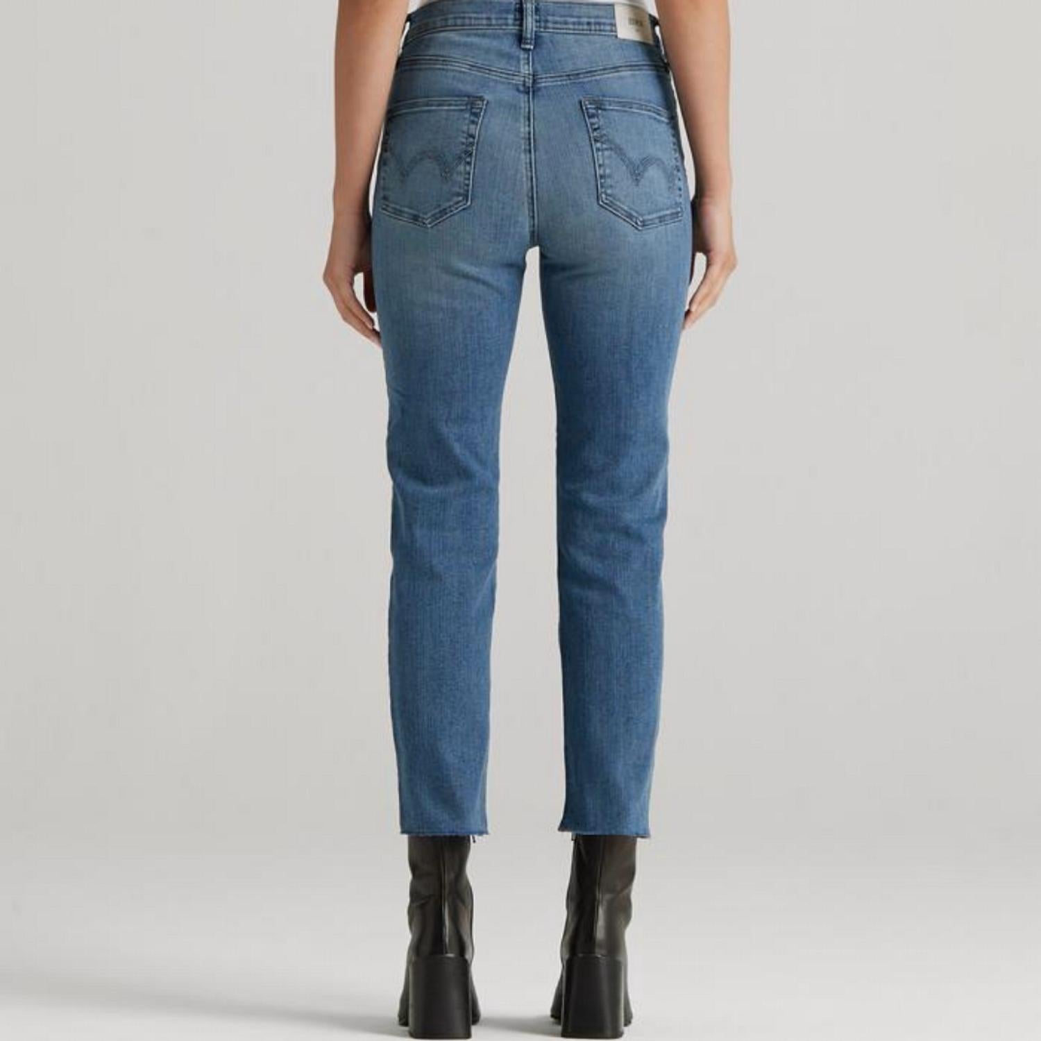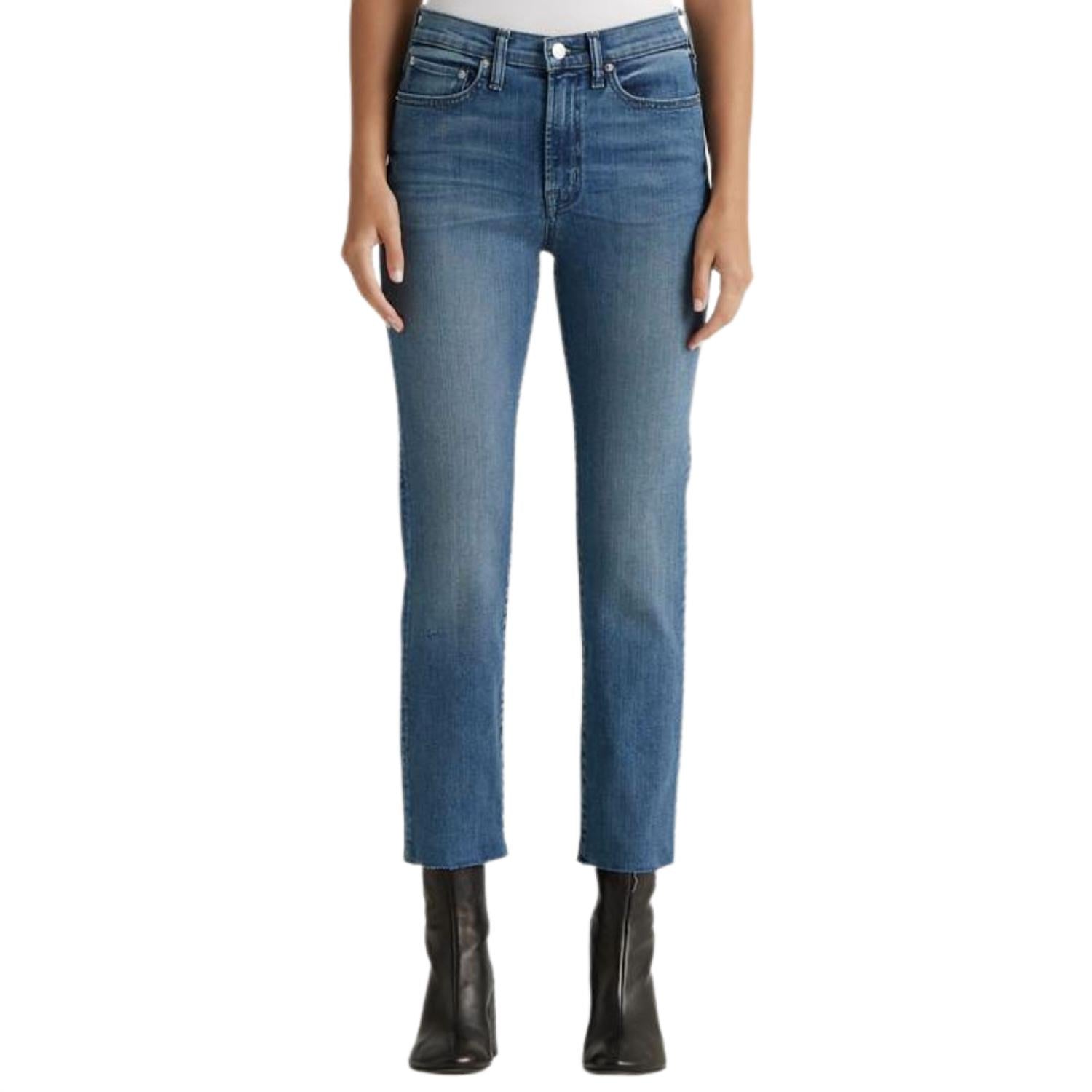 This classic straight leg jean has a perfect fit and goes with just about everything. Features a flattering mid-rise silhouette that’s fitted through the hips with a slim, straight leg. Finished in a light indigo wash with a natural worn pattern. Material: 98% Cotton, 2% Spandex. Wash cold. True to size. Measurements - Front rise: 9 3/4" | Leg Opening: 13” | Inseam: 27".