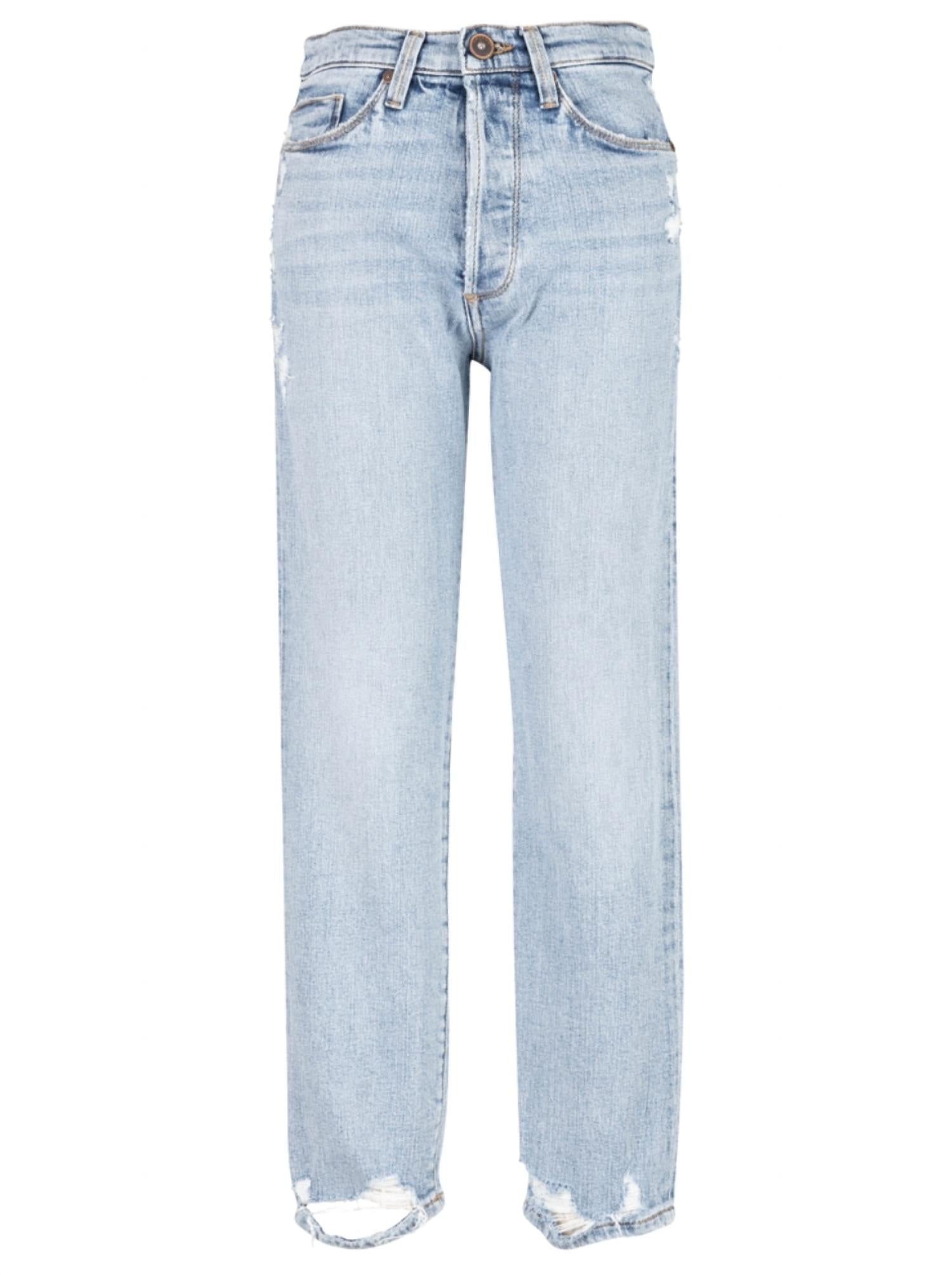 This classic straight leg jean has a perfect fit and goes with just about everything. The Olivier High Rise Long Straight Jeans by Edyson offer a flattering high-rise silhouette with a long, straight leg cut. These jeans, sporting an inseam of 28 inches, feature a hidden button fly for a sleek look, and the luxurious comfort stretch fabric ensures a loose fit through the hips, thighs, and knees. Crafted in a chic Light Fiori color, they showcase artfully distressed hems for an added touch of sophistication. Designed with convenience in mind, their classic straight leg style and solid pattern make them a versatile choice for spring occasions.