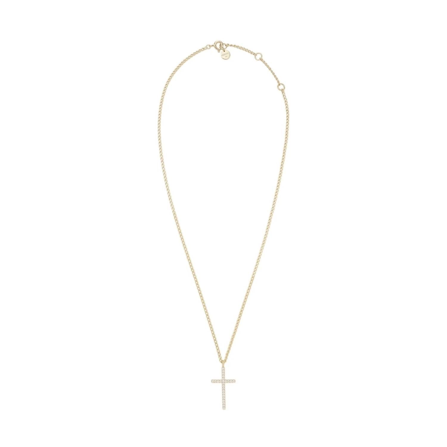 Introducing the Women's Cz Cross Pendant Necklace by Eklexic, a stunning blend of luxury and modern design. Crafted with 925 recycled silver, this necklace is artfully plated with 14K gold vermeil and features a 1-inch vertical cross pendant adorned with 25 sparkling 1.4mm cubic zirconia stones. Perfectly adjustable with a 16-inch length plus a 2-inch extension, the 2.3mm curb chain ensures a sleek fit for any neckline. This fine necklace merges sustainability with elegance, making it an essential addition to any jewelry collection.