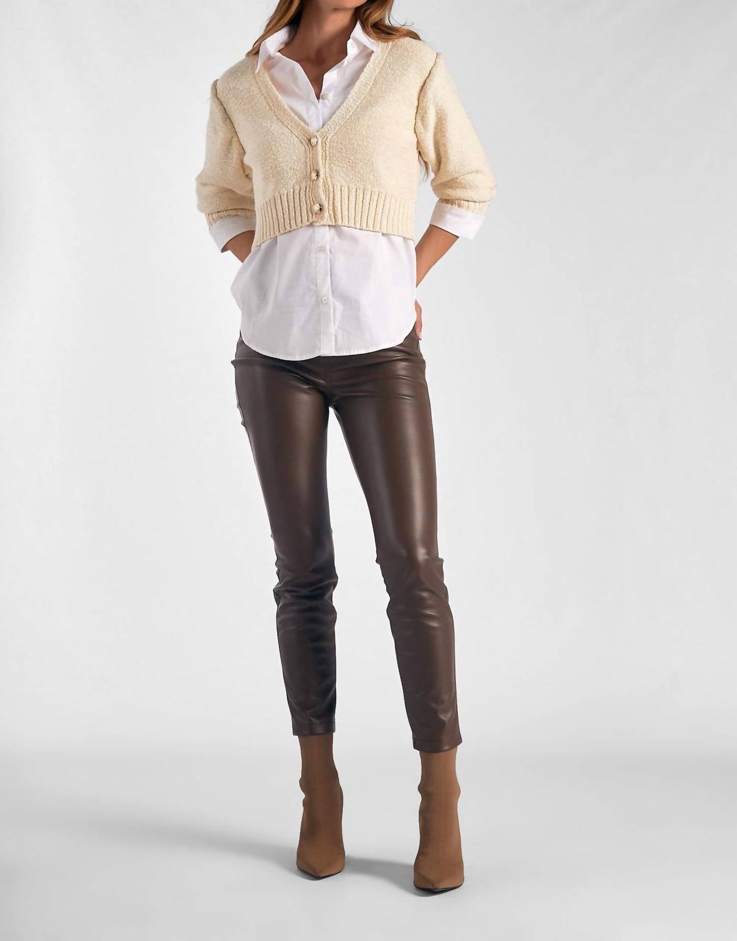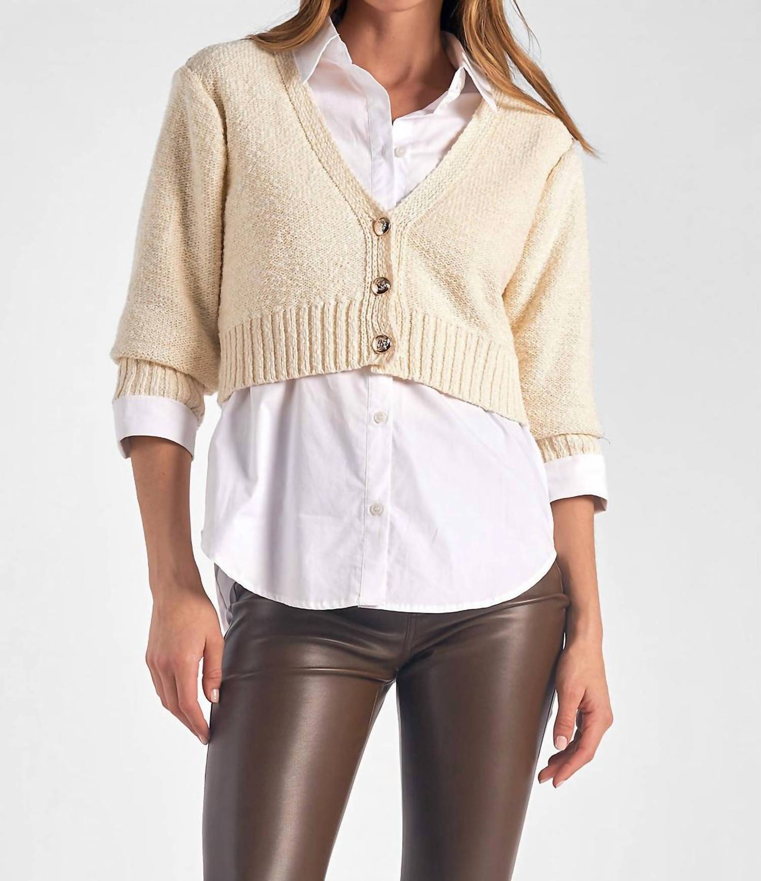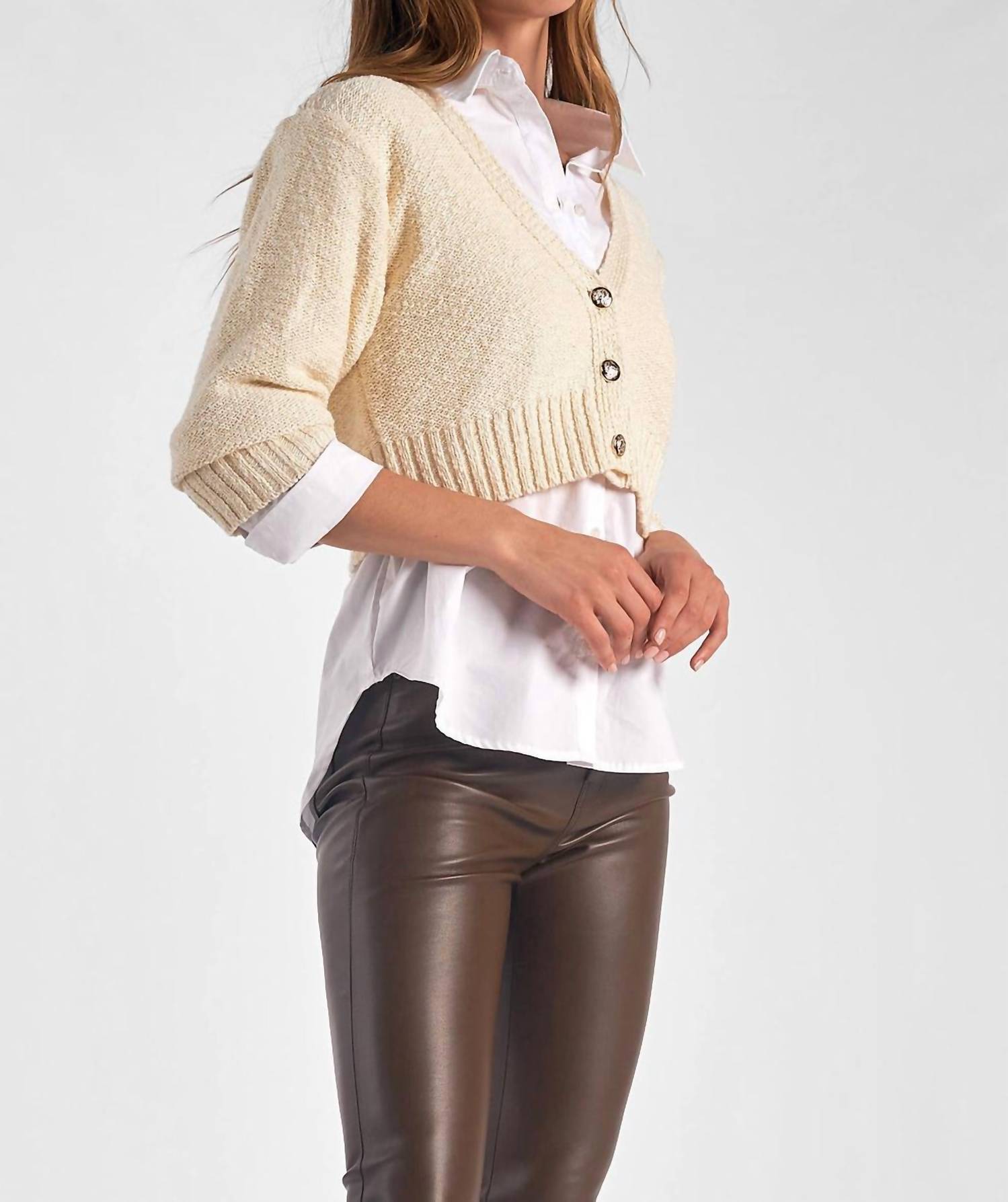 A timeless v-neck sweater that works season after season. Elevate your style with the Crop Sweater Combo by ELAN, featuring a chic Off White hue and a dynamic color block design. This combo includes a cropped sweater cardigan layered over a crisp white button-up shirt, boasting a relaxed V-neckline and three-quarter sleeves. Crafted with a blend of 60% cotton and 40% acrylic, and 100% cotton, it ensures comfort and a modern edge. Closure: Button closure. Care: Hand wash. This versatile piece fits true to size, with options to size up for an oversized fit or down for a more tailored look.