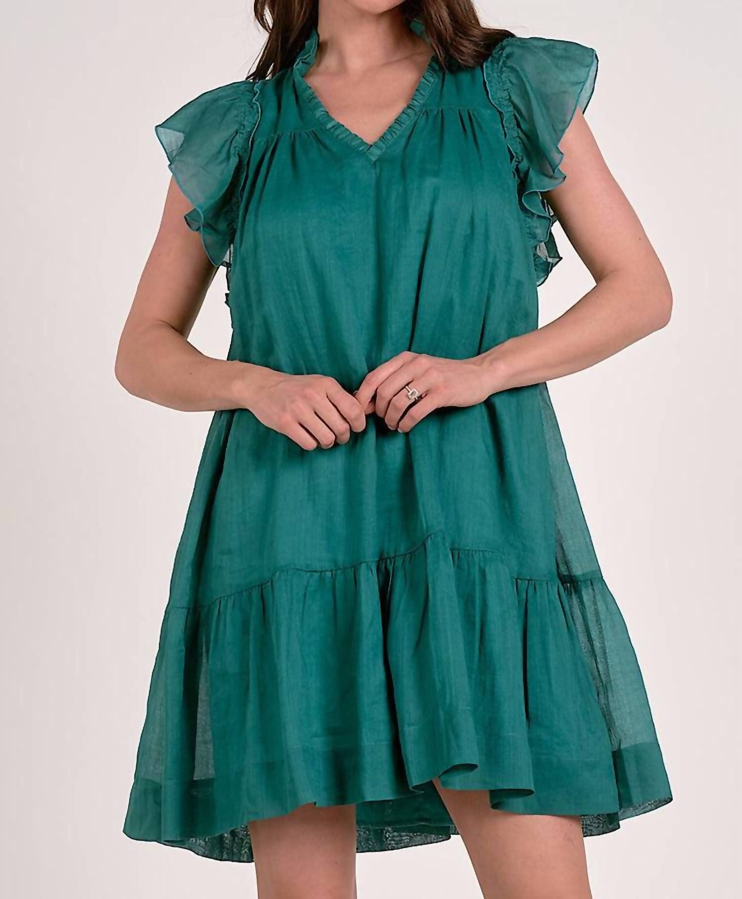 Casual, comfortable and cute! The dress that you'll be reaching for all season long. Discover the elegance of the Flutter Sleeve Dress by ELAN, a must-have in enchanting emerald. This women's dress features short flutter sleeves and a chic V-neckline, offering a playful shift silhouette ideal for spring celebrations. Crafted from 100% ramie with a convenient pull-on closure, its charming tiered design promises both style and comfort. Model wears size small (5'10" height, 34" bust, 24" waist, 36" hips).