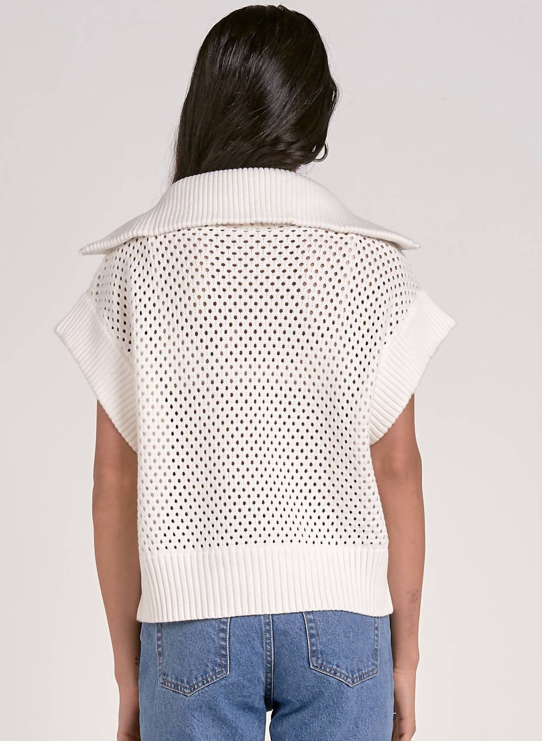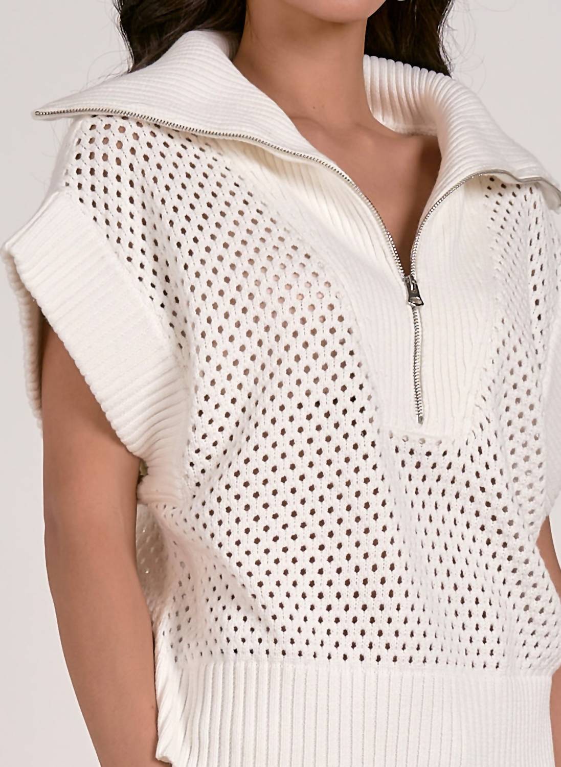 Introducing the ELAN Half Zip Collared Sweater, a stylish addition to any fashion-forward woman's wardrobe. This textured V-neck sweater in white is designed with short sleeves and an oversized collar, offering a trendy yet comfortable fit. Its pull-on closure and collar neckline make it effortlessly chic. Care instructions: Hand wash only.