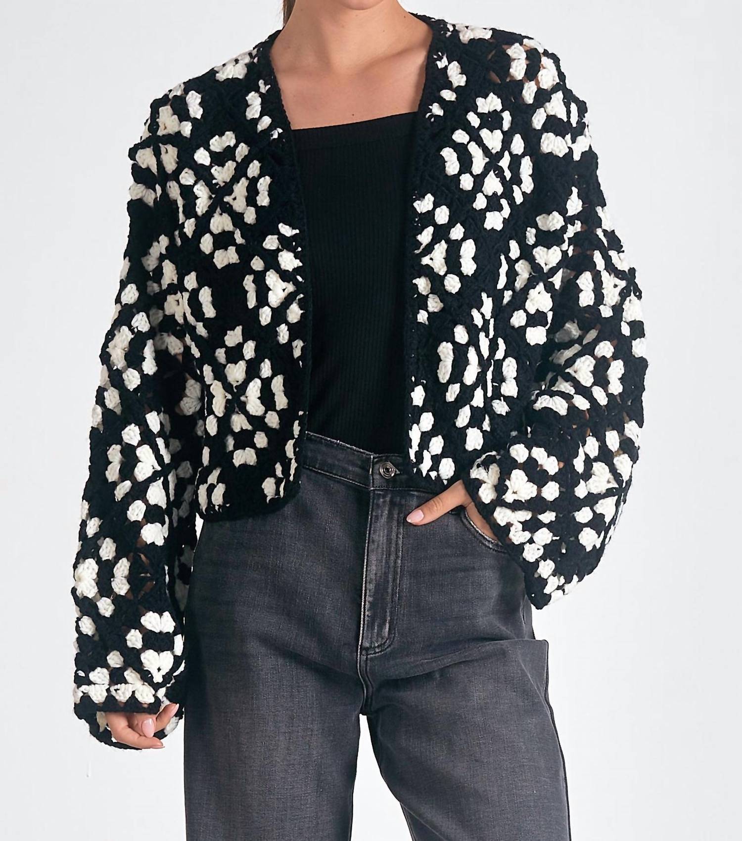 Elevate your wardrobe with the Kylee Macrame Cardigan by ELAN, a chic and playful staple for any fashion-savvy individual. This cardigan features long bell sleeves in a trendy black and white textured pattern. Crafted from acrylic, it boasts a cropped length and a stylish V-neckline, perfect for winter occasions. Designed with a pull-on closure, it is easy to wear and maintain with simple hand wash and lay flat to dry instructions.