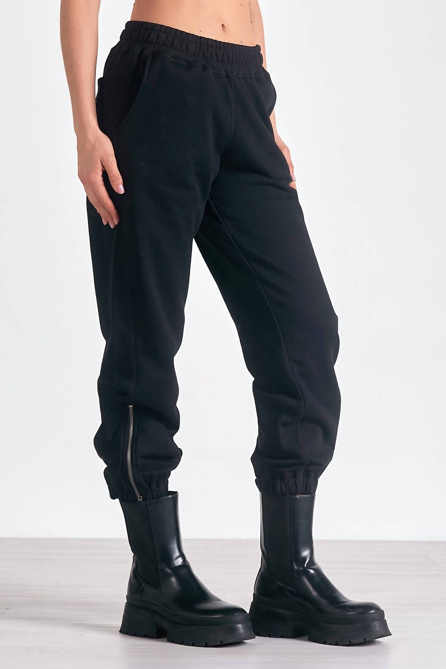 Pair these with your favorite sneakers for an effortlessly cool look. Features French Terry joggers with an elastic waistband. Zipper leg detail. Cuffed legs. True to size. Model is 5'9", with a 32" bust, 23.5" waist, and 33.5" hips, wearing size small. Machine wash cold. 100% Cotton.