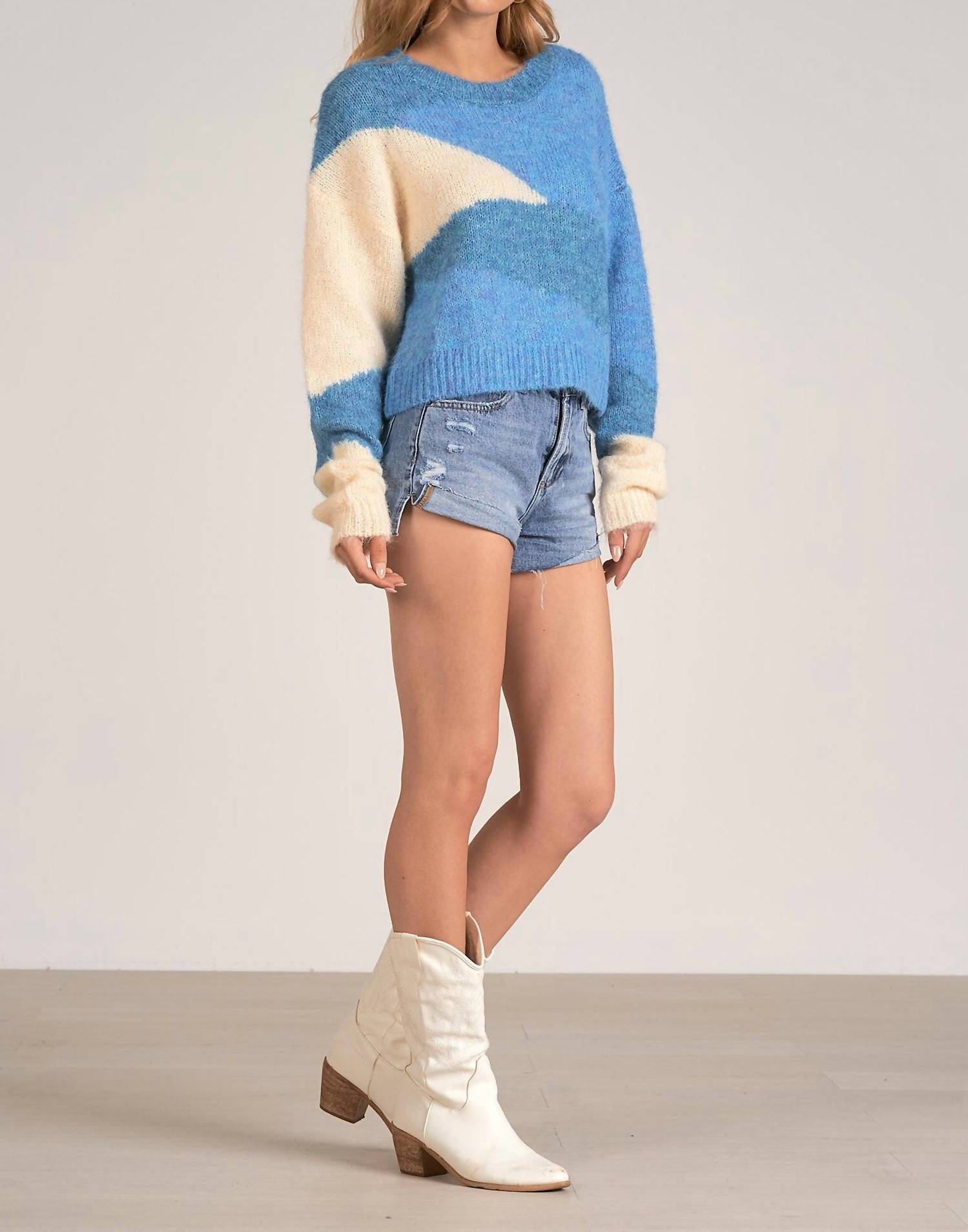 Experience the perfect blend of comfort and style with this trendy crew neck sweater, designed to effortlessly elevate your wardrobe. Pair it with your favorite denim and loafers for the perfect look. Introducing the Triangles Round Neck Sweater by ELAN, an elegant addition to your evening wardrobe. This blue women's sweater features long sleeves and a crewneck, offering both comfort and style for fall occasions. With its textured pattern, it's perfect for adding a touch of sophistication to your look. Closure: Pull on.
